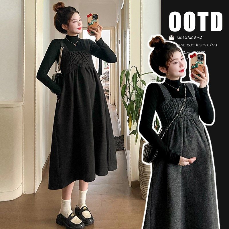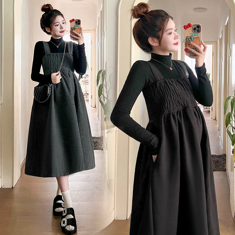 秋冬款孕妇装2023新款时尚连衣裙打底套装毛呢背带裙小个子两件套