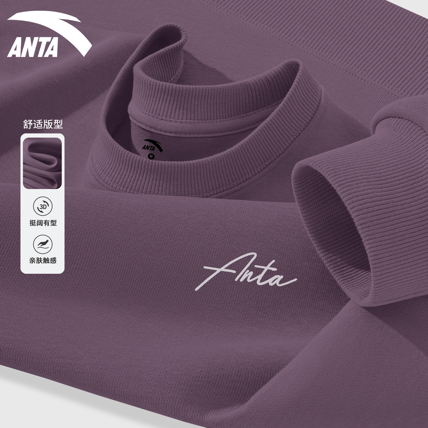 安踏紫色卫衣女款气质休闲圆领长袖春秋百搭洋气短款宽松运动服女