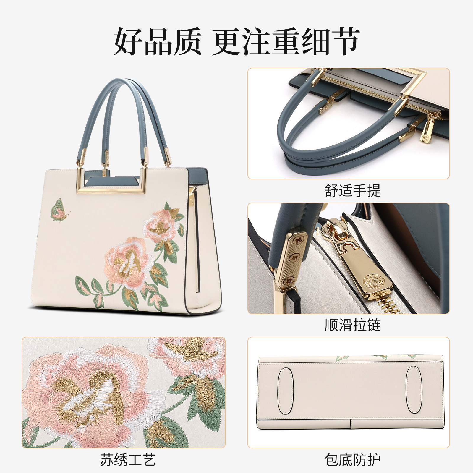 三八节礼物神婷包包女款真皮刺绣手提大气国风婚包妈妈包中年女包