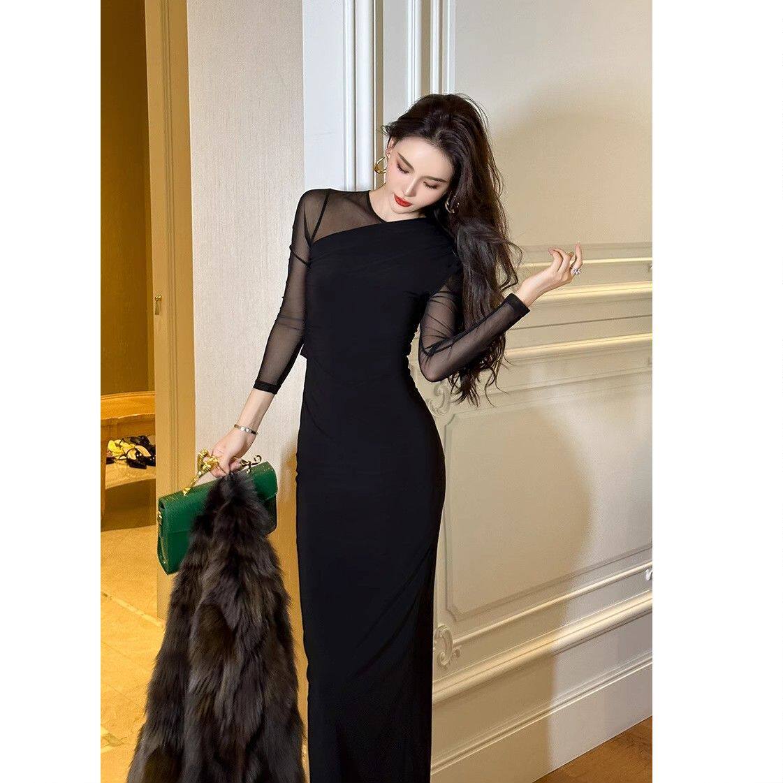 2025秋冬装新款复古女装法式性感网纱显瘦包臀连衣裙内搭打底裙潮