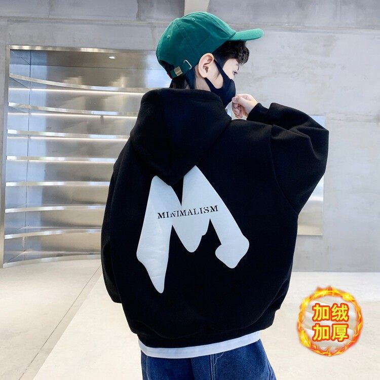 男童加绒卫衣秋冬2025新款儿童炸街加厚一体绒中大童冬季连帽外套