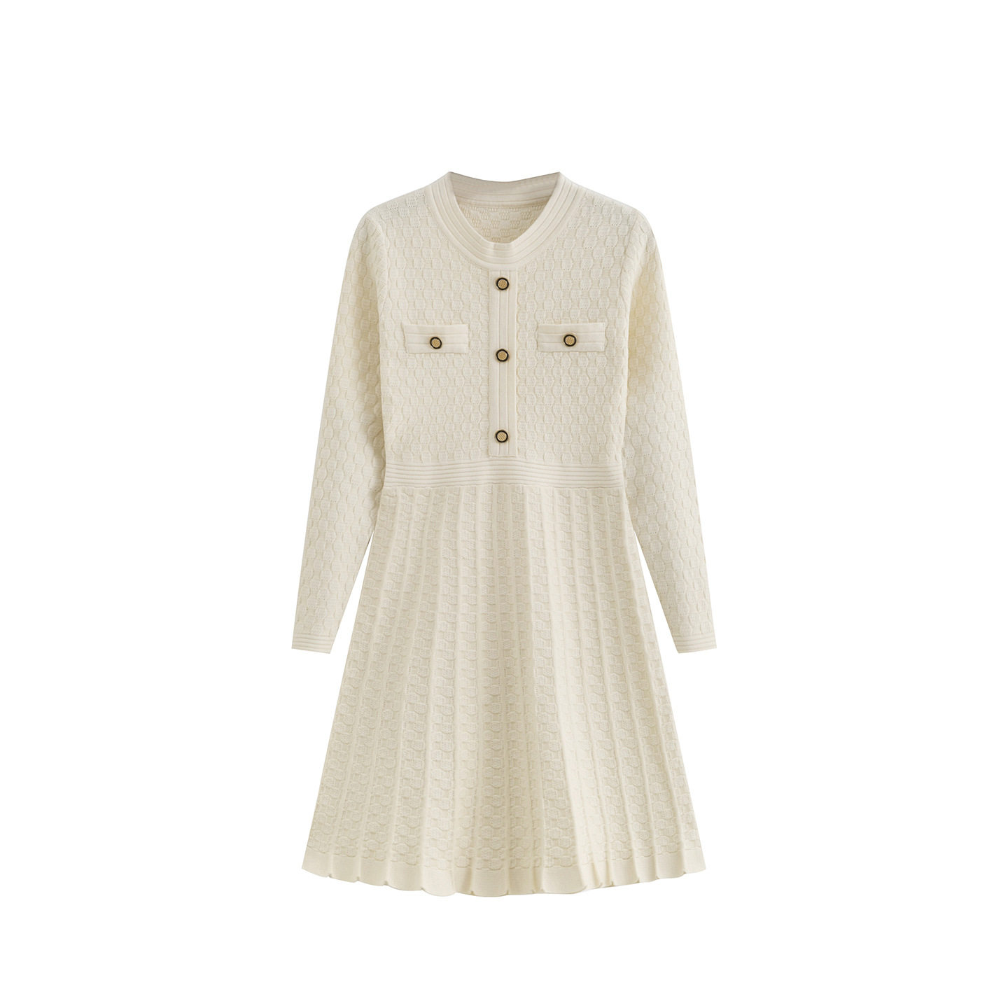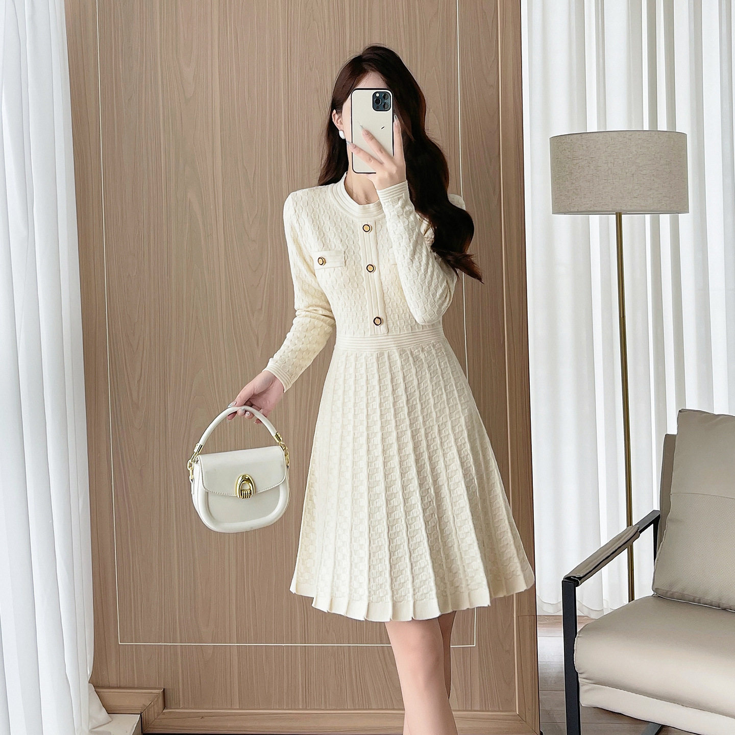 春季小香风圆领长袖连衣裙女小个子气质收腰毛衣裙长袖针织裙子