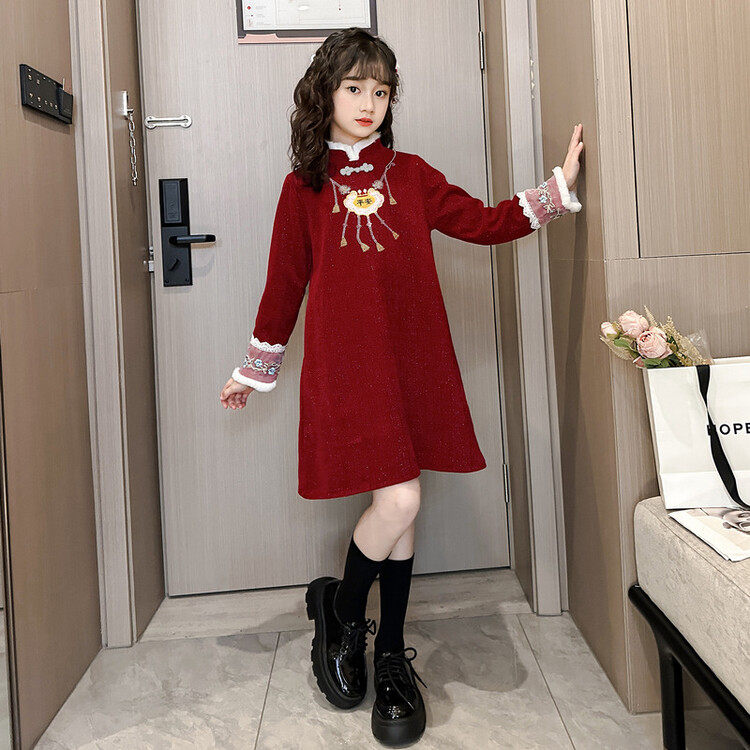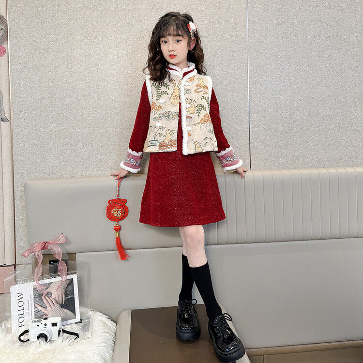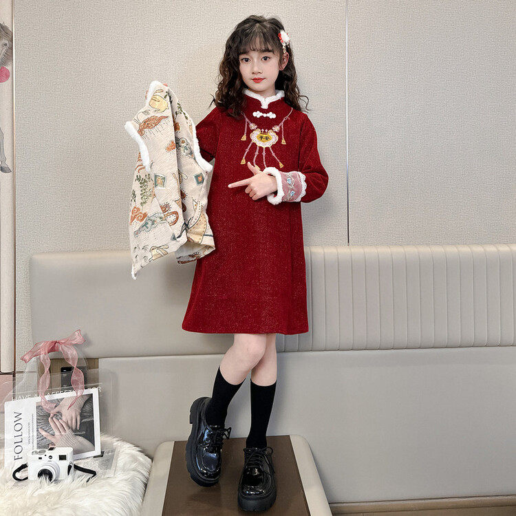 女童连衣裙套装加绒2025新款儿童冬装红色拜年服加厚女孩新年衣服