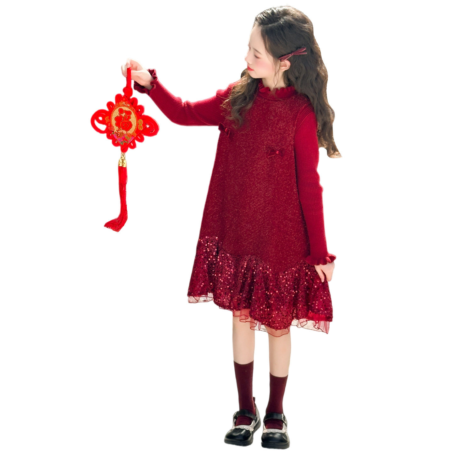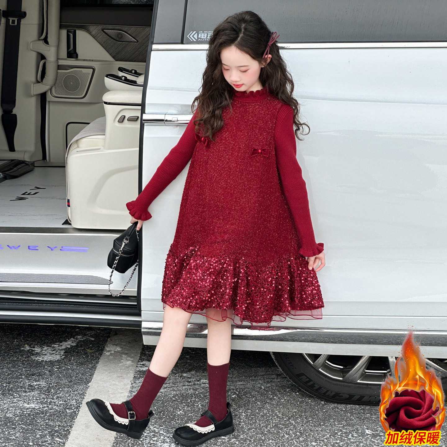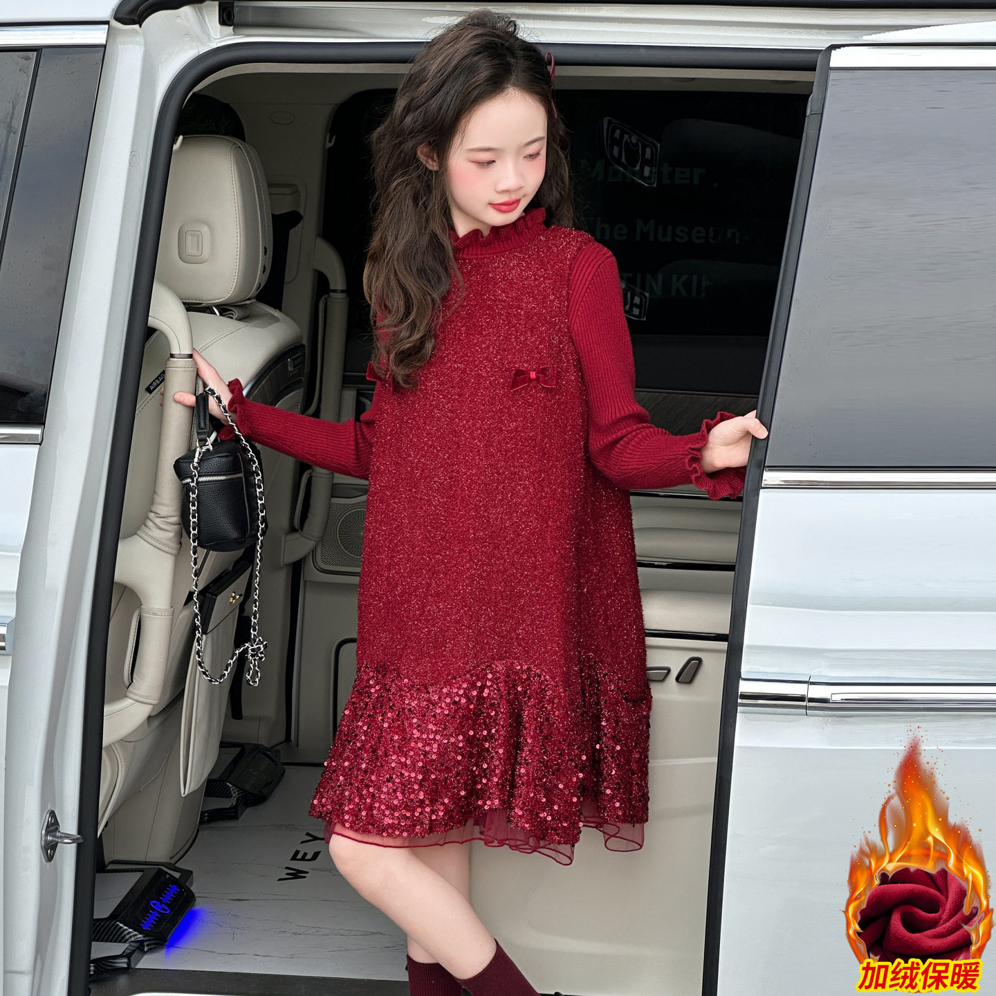 女童富家千金感裙子红色亮片加绒连衣裙秋冬装2025新款毛衣背心裙