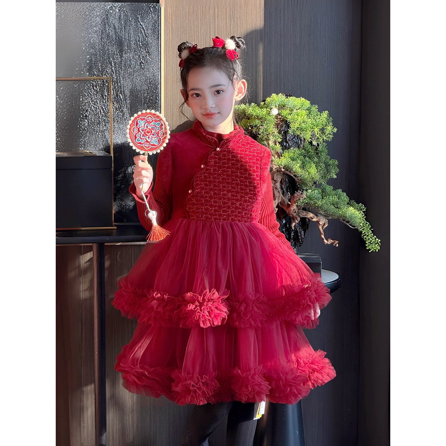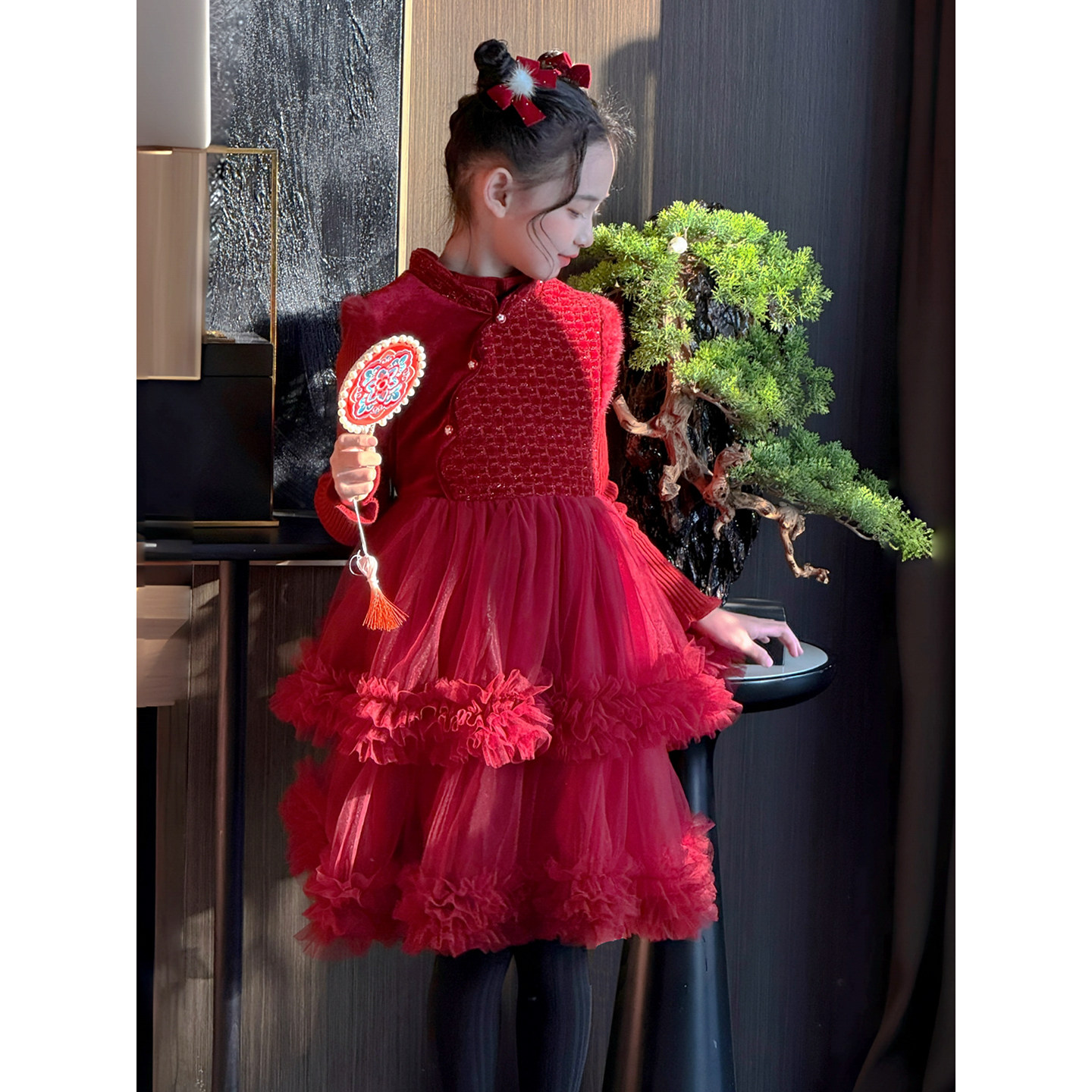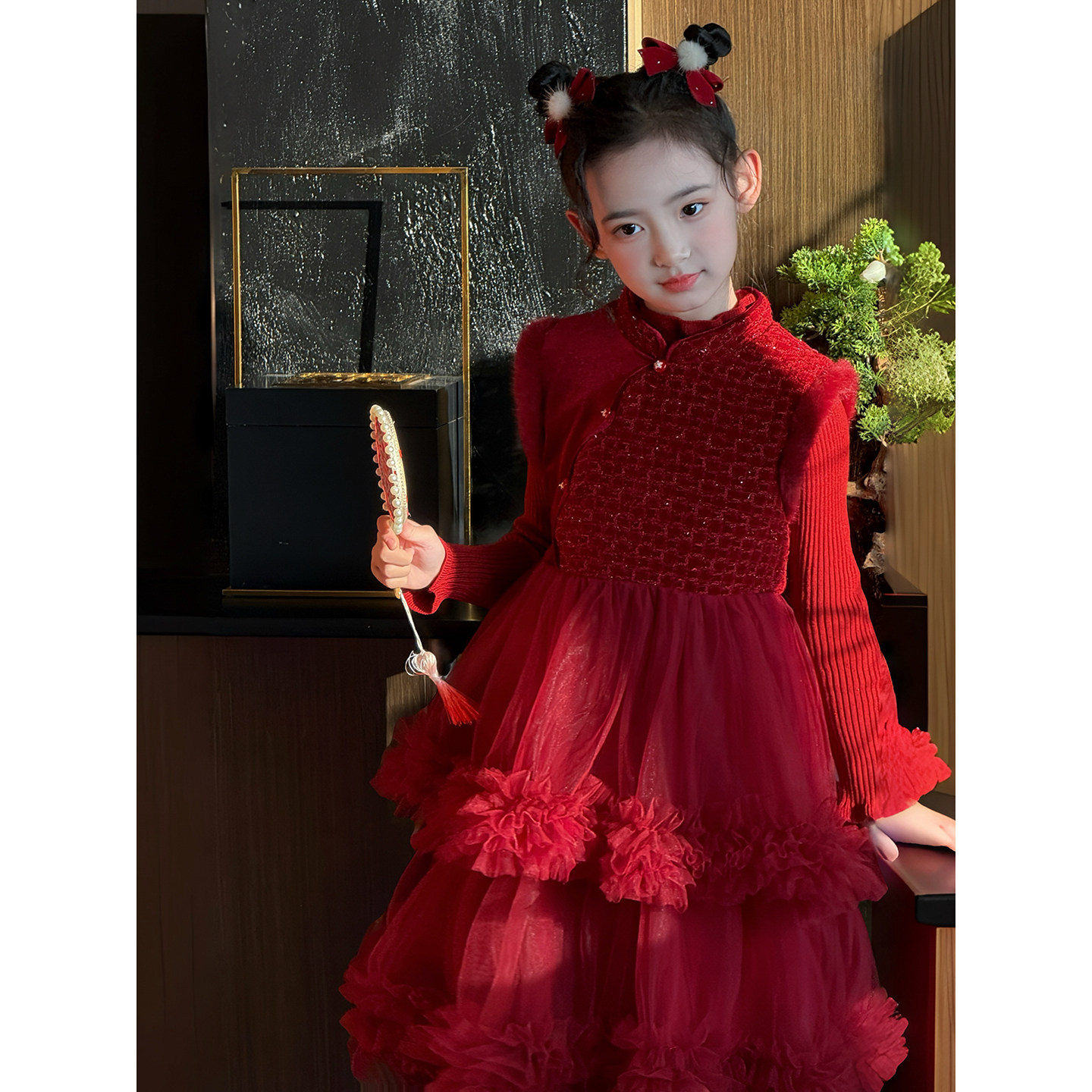 女童连衣裙套装冬季新款儿童拜年服新中式裙子背心裙网纱裙蓬蓬裙