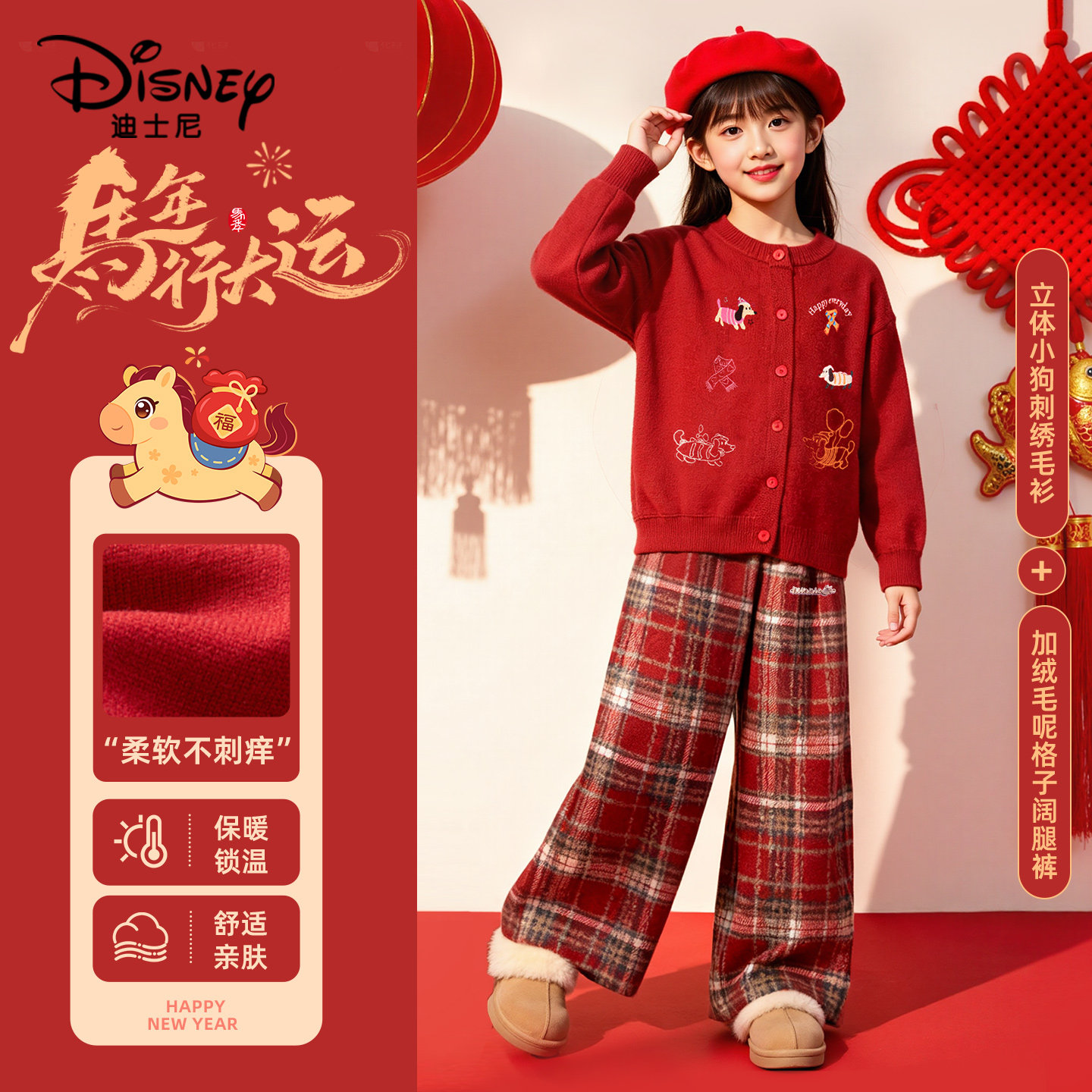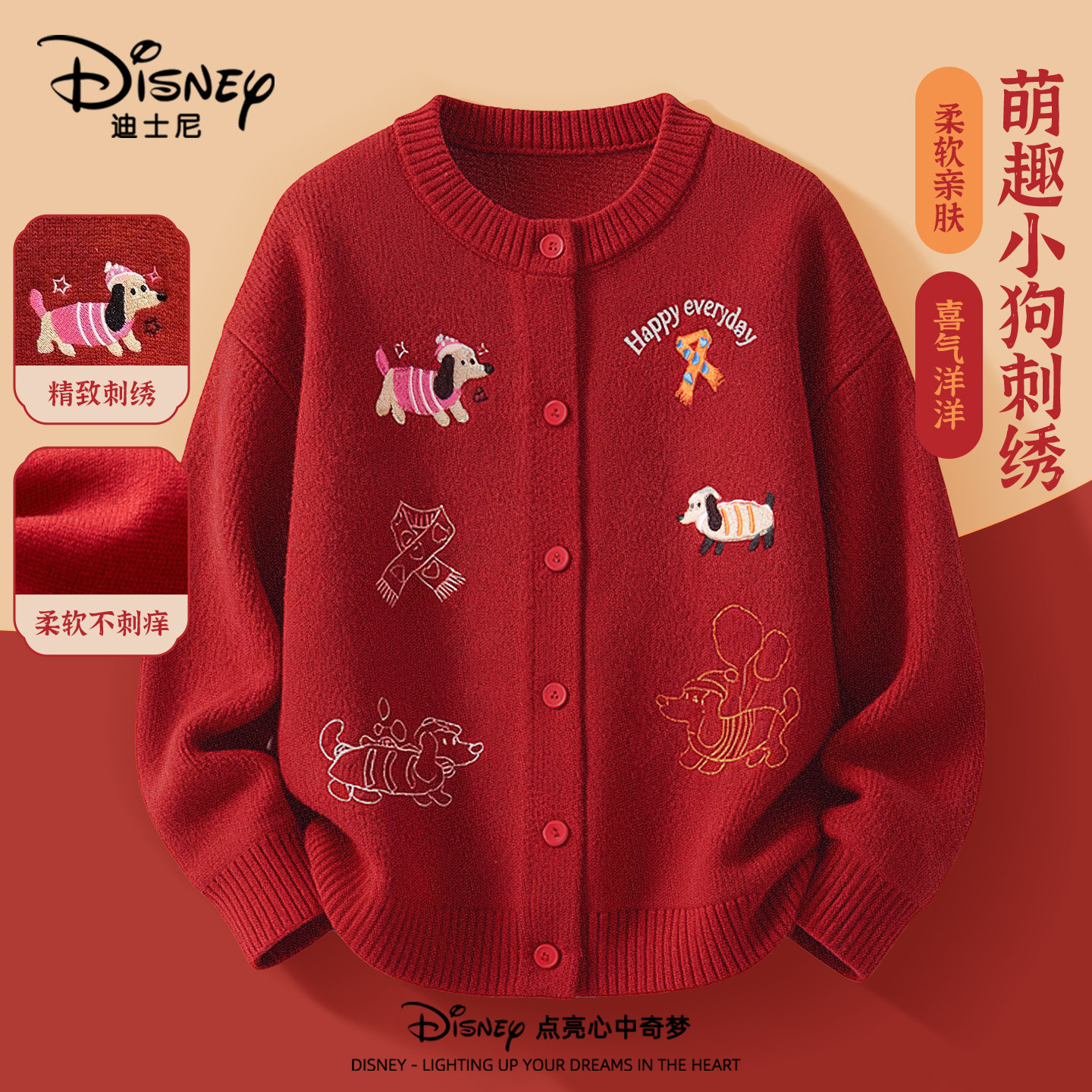 迪士尼女童红色毛衣冬装开衫2026马年新款拜年服喜庆儿童针织衫女