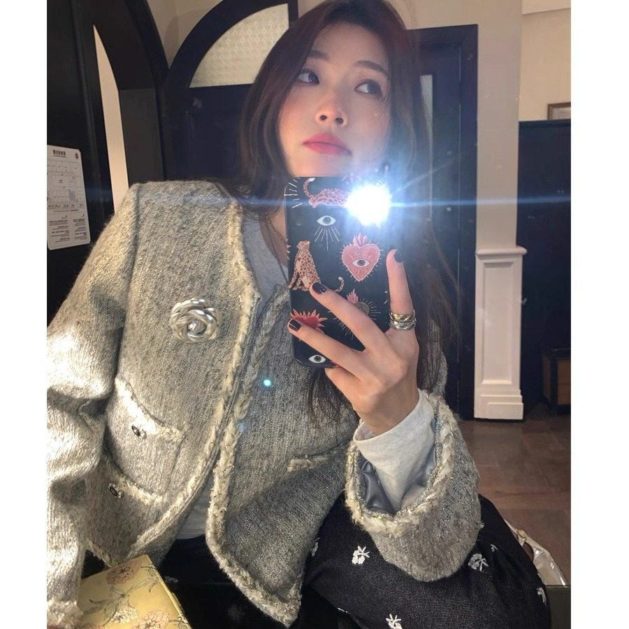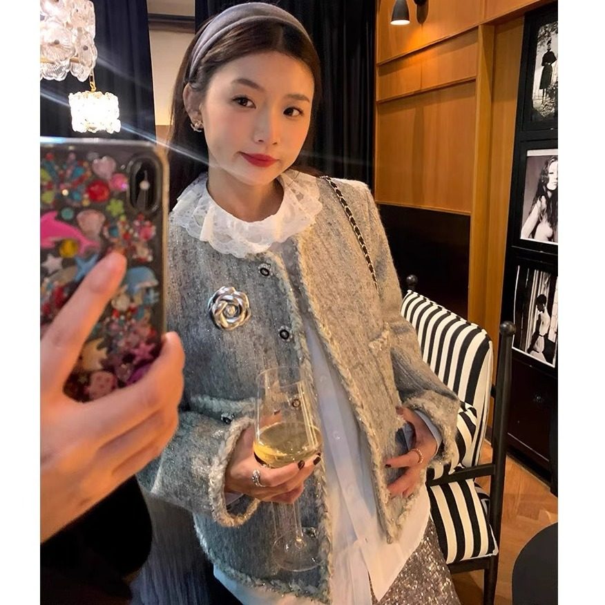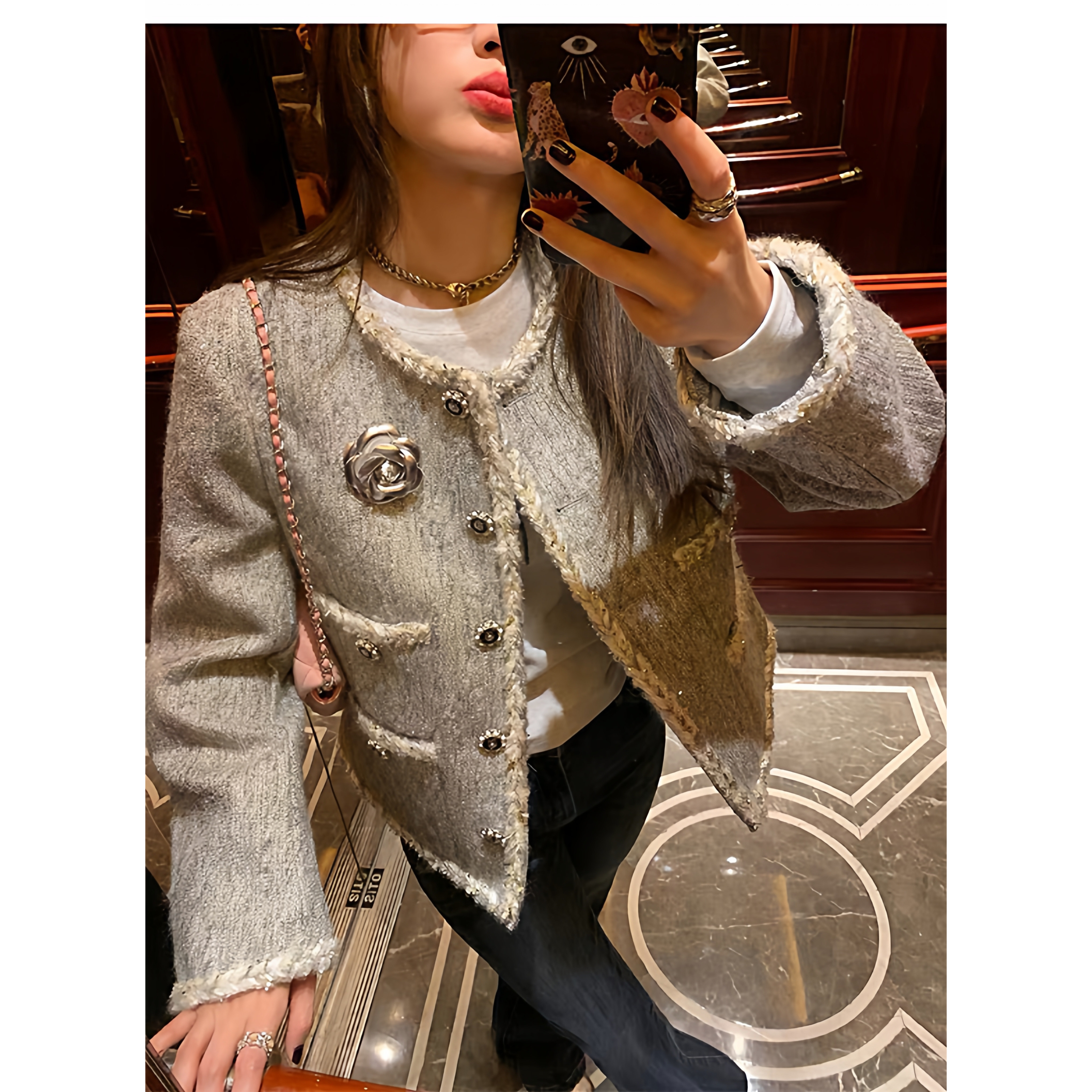 法式重工小香风外套气质千金亮丝灰色编织毛呢外套小个子开衫上衣