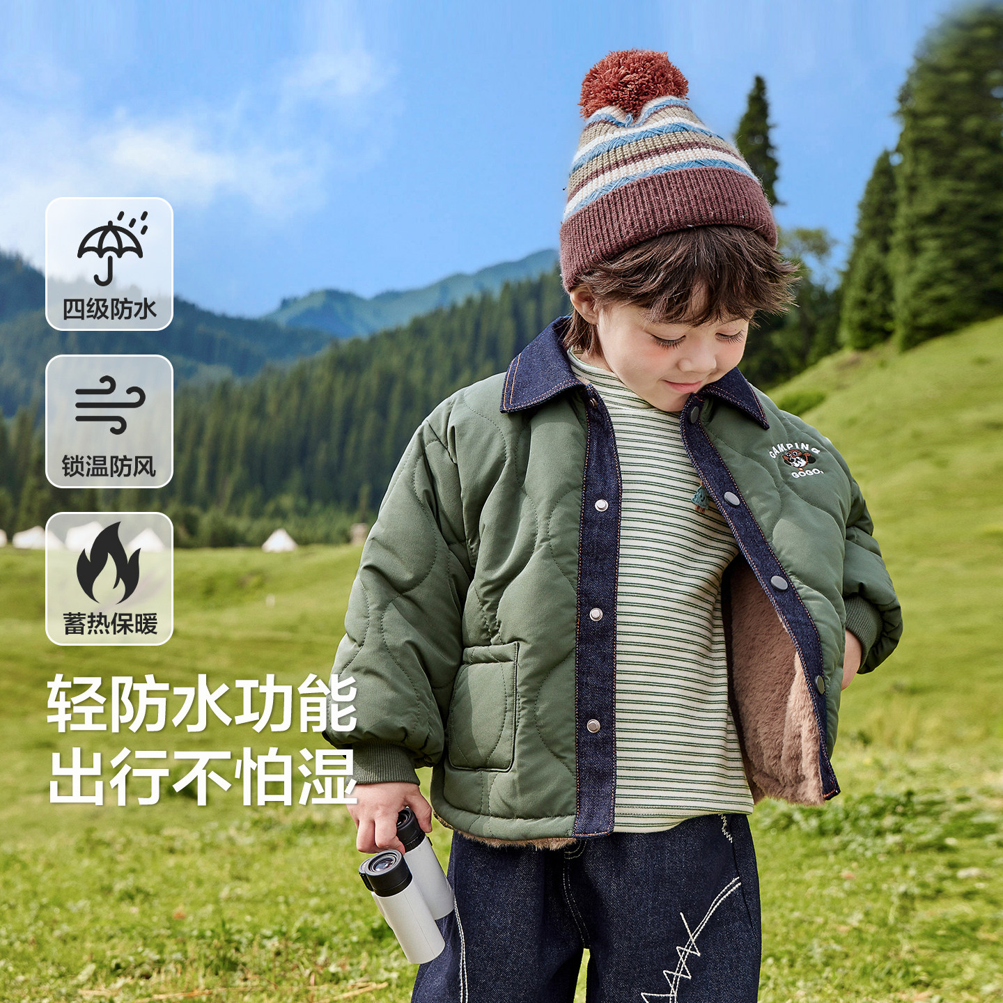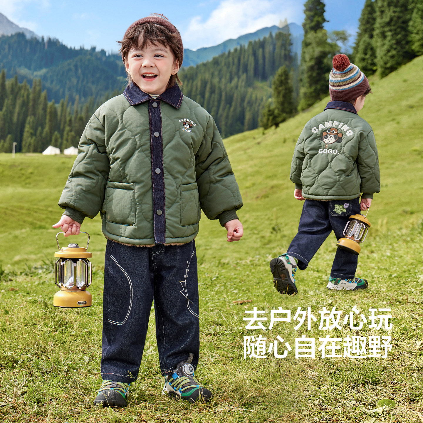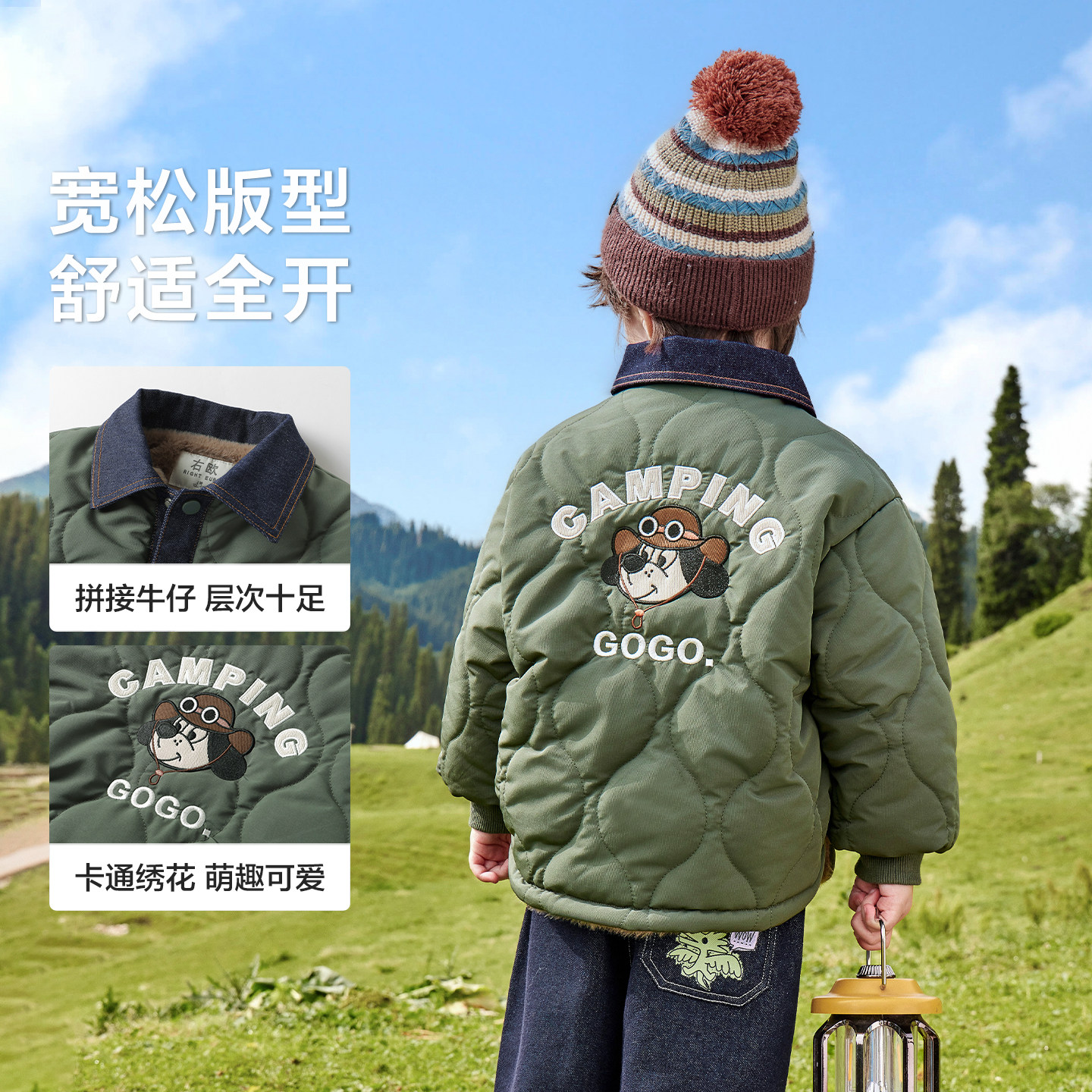 右欧男童女童加绒加厚外套牛仔翻领时髦冬季新款童装儿童小熊棉衣