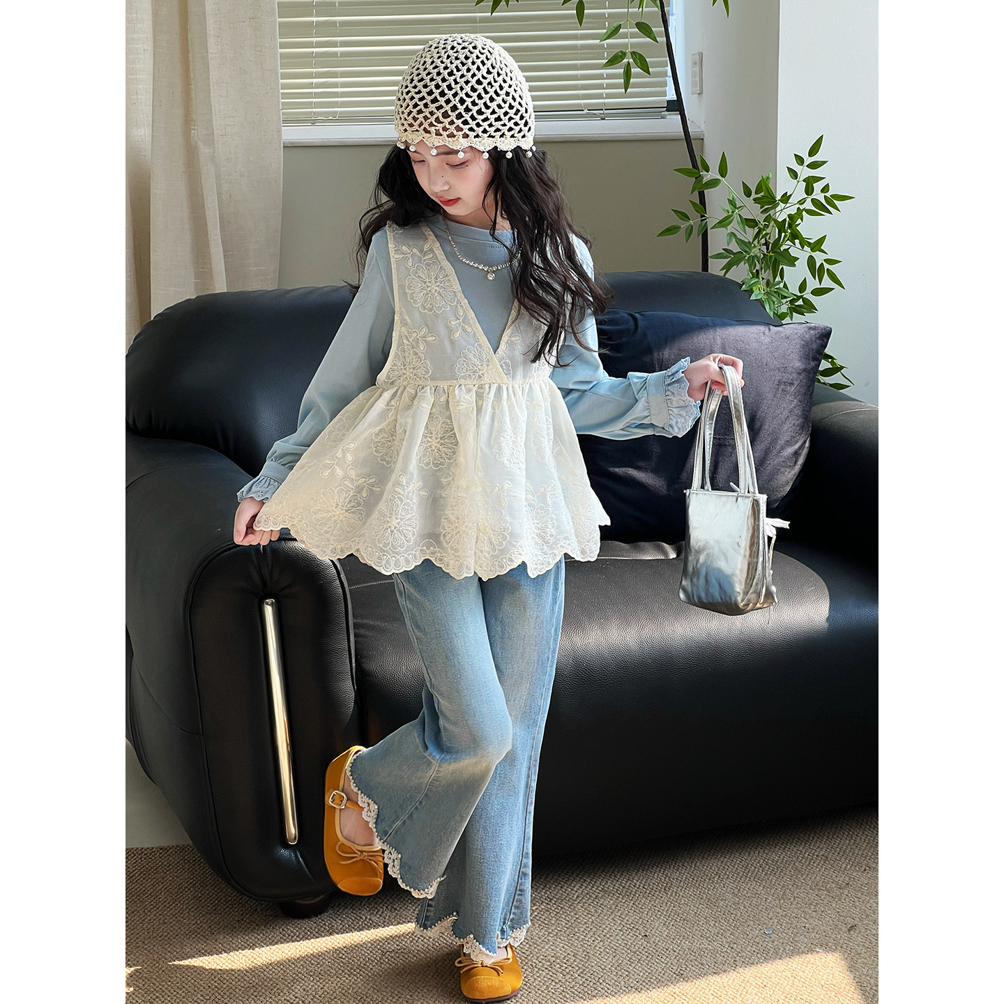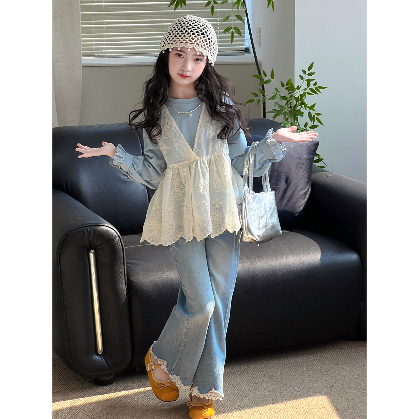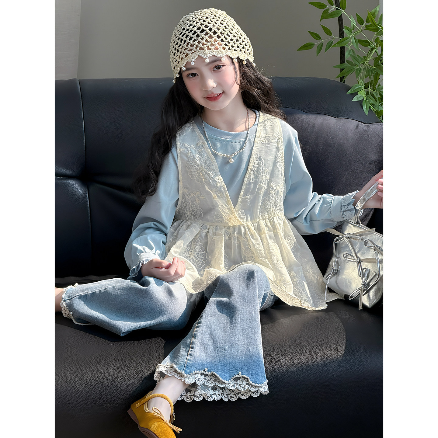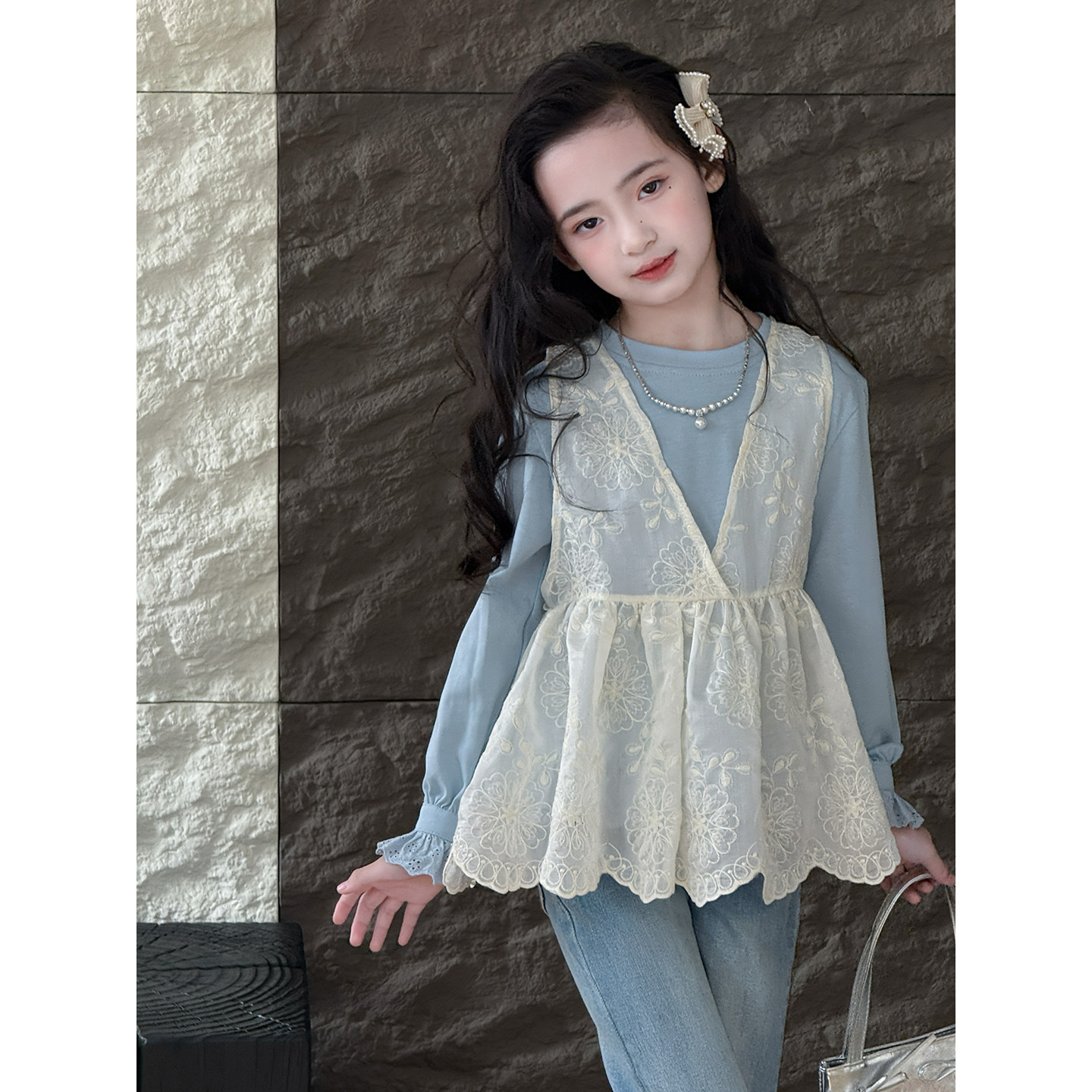 女童套装2026春季新款儿童蕾丝背心打底衫女孩洋气上衣春装两件套