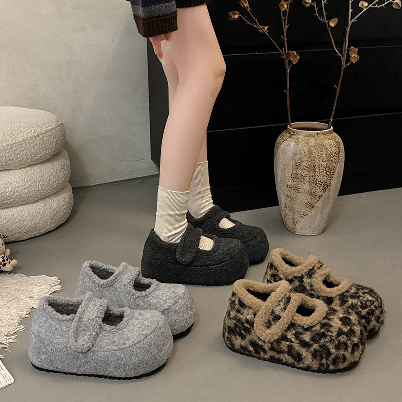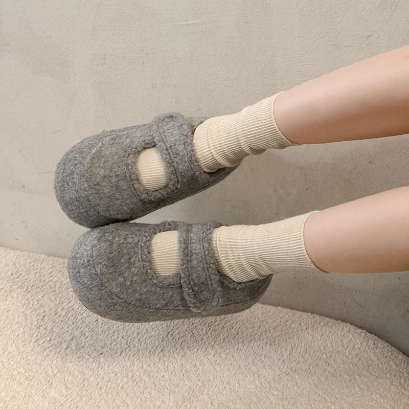 内增高厚底勃肯鞋女加绒灰色玛丽珍毛毛鞋女冬外穿韩版呢子棉鞋子