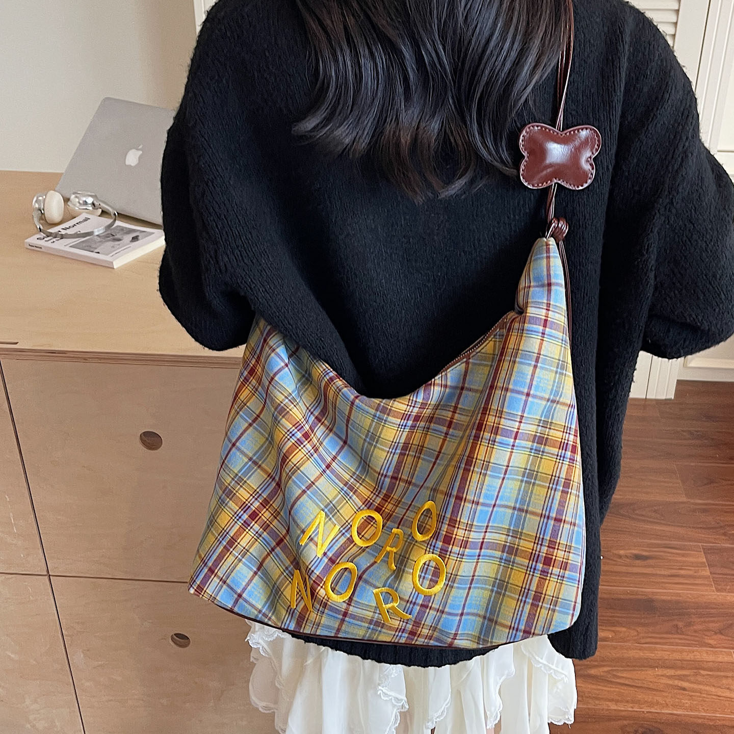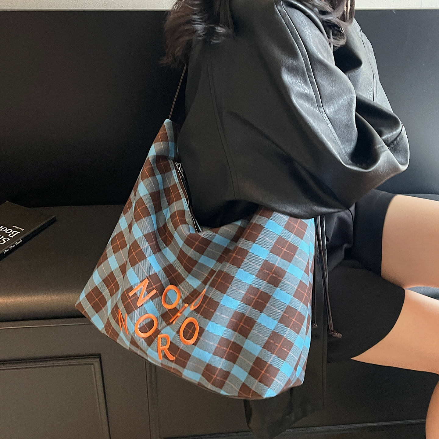 复古格纹托特包便携通勤大容量拉链单肩包帆布包时尚格子布袋百搭