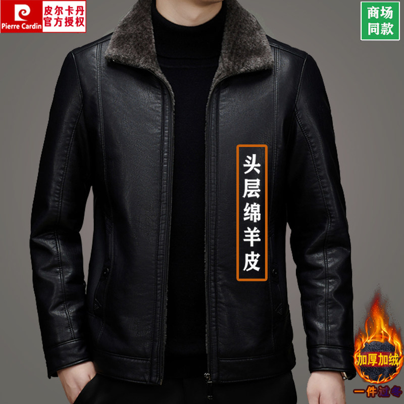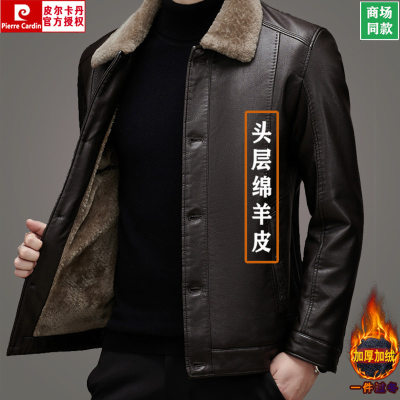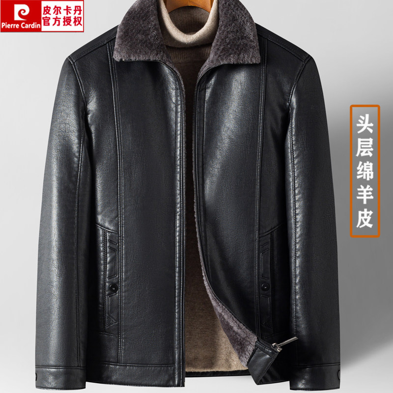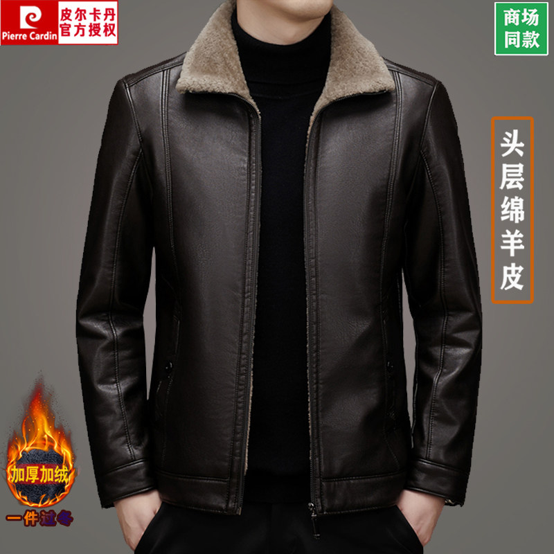 皮尔卡丹真皮皮衣男冬季加绒加厚皮毛一体海宁绵羊皮中年爸爸外套