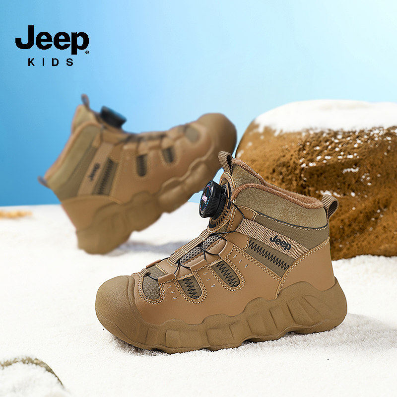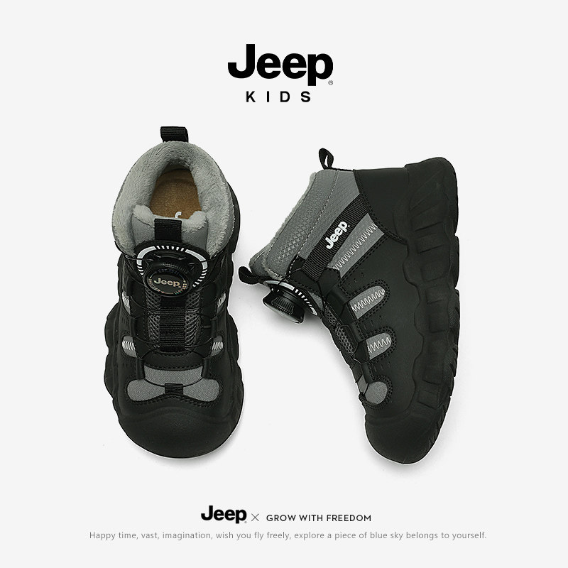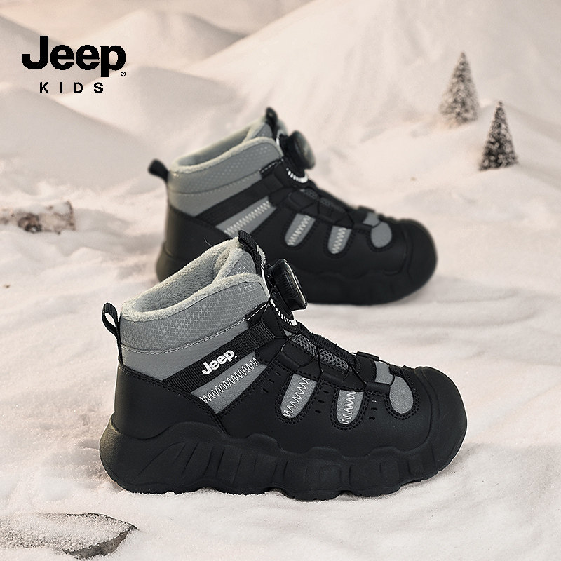 Jeep儿童黑色运动鞋高筒加绒棉鞋女童防滑2025新款冬季男童二棉鞋