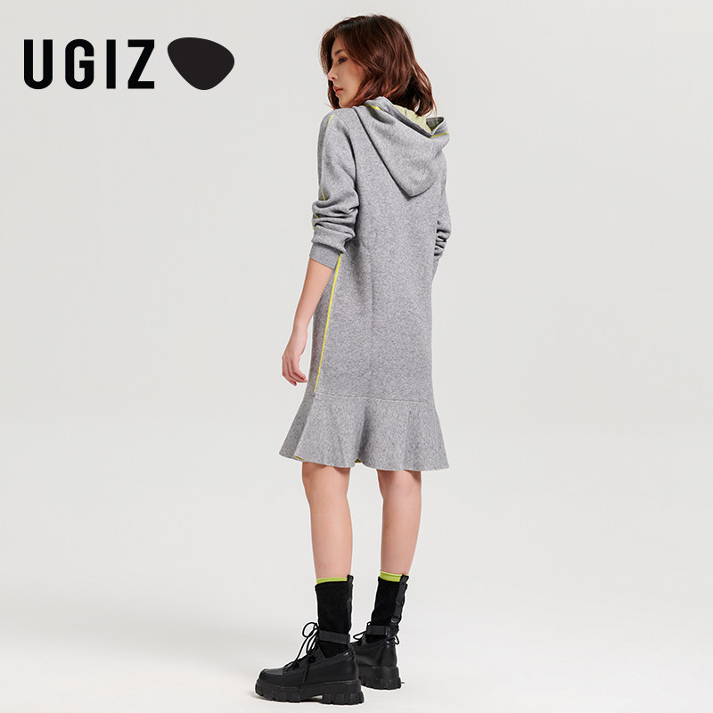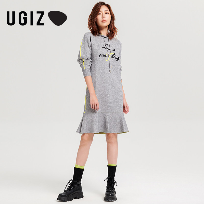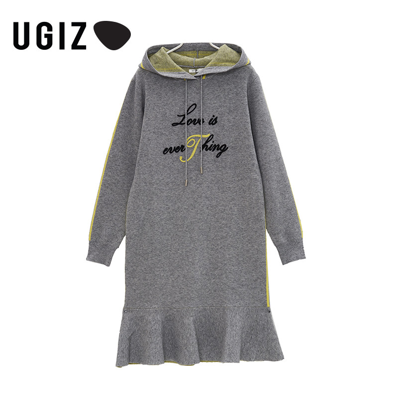 UGIZ冬季新款韩版女装中长款连帽长袖字母针织连衣裙女UDLD901