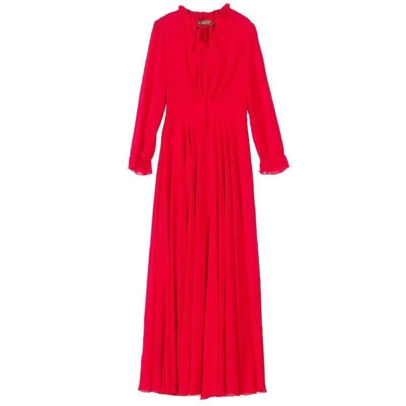 春夏新款长袖系带领纯色雪纺连衣裙女修身显瘦沙滩度假长款大摆裙
