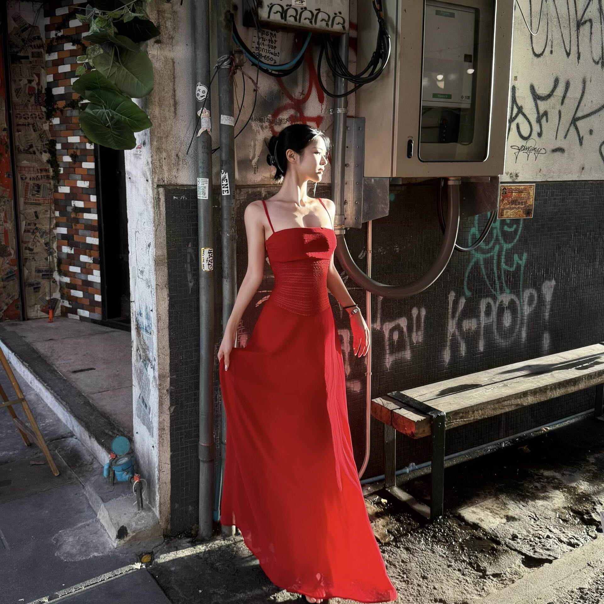 法式复古绝美红色海边度假沙滩长裙女夏高级感镂空抹胸吊带连衣裙