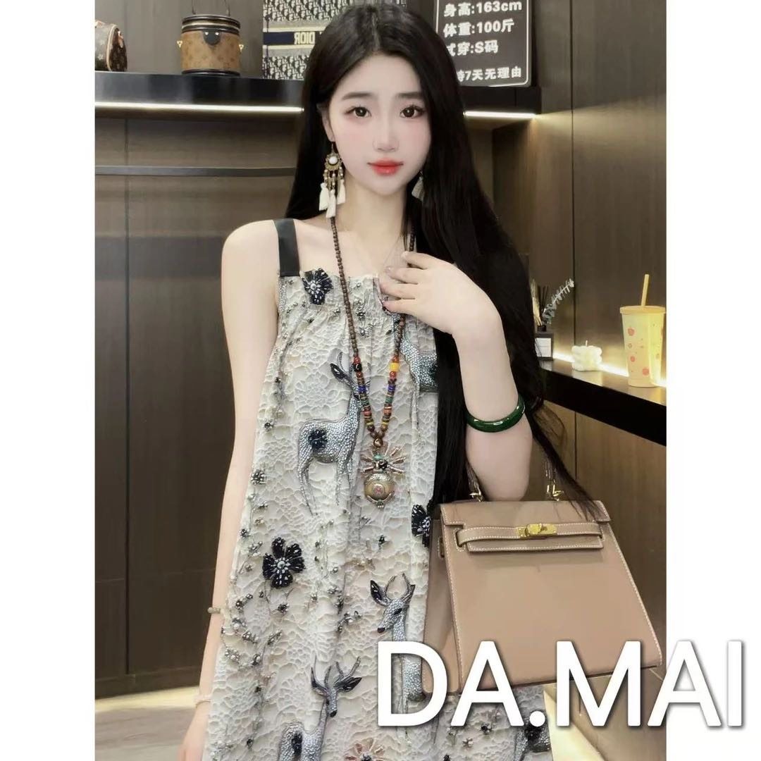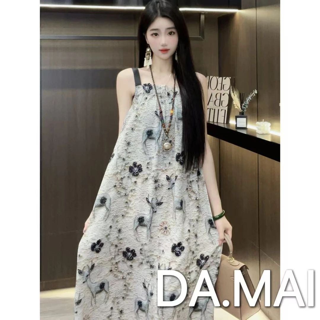 海边度假风胖MM新中式夏季新款吊带裙大码宽松遮肉显瘦印花连衣裙