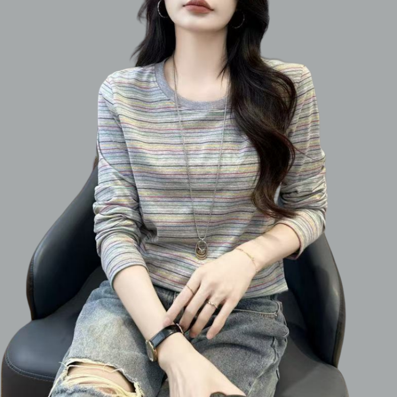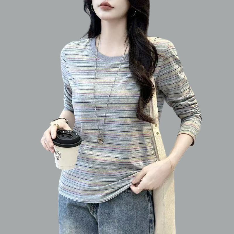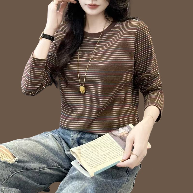 2026春季新款宽松纯棉秋衣长袖打底衫女t恤春秋条纹上衣妈妈小衫