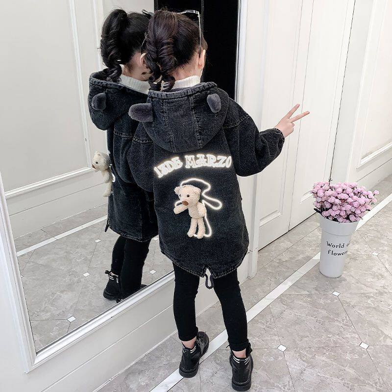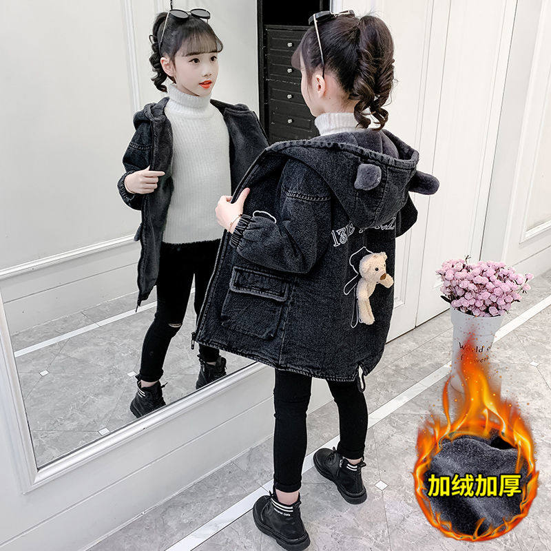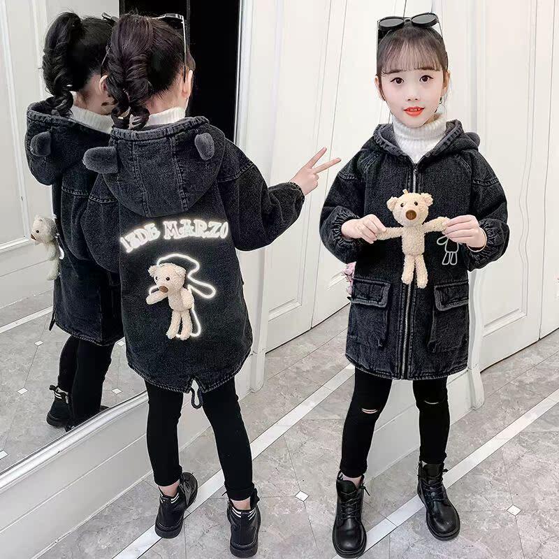 女童外套2024新款洋气女孩冬天中长款秋冬加绒加厚儿童牛仔外套潮