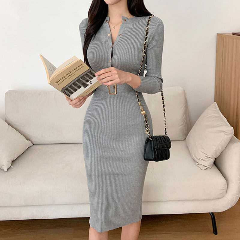 韩国chic秋季优雅简约圆领修身显瘦长袖针织包臀连衣裙配腰带女