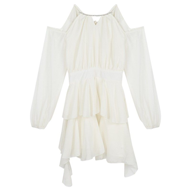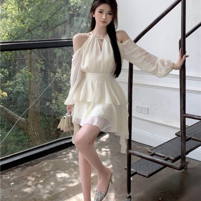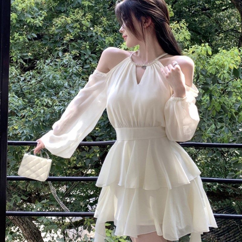 法式白色长袖露肩连衣裙夏季大码胖mm甜美雪纺短裙荷叶边蛋糕裙子