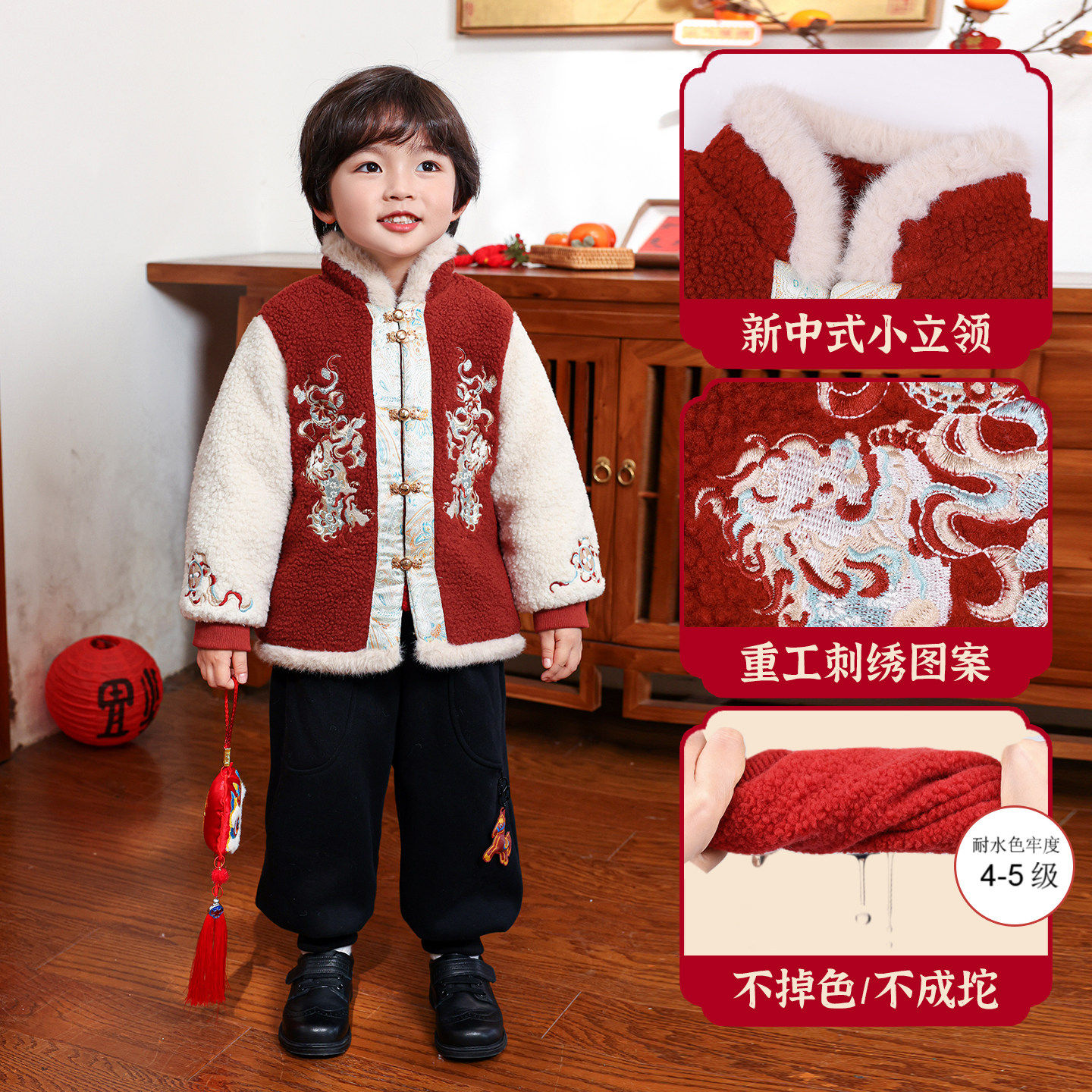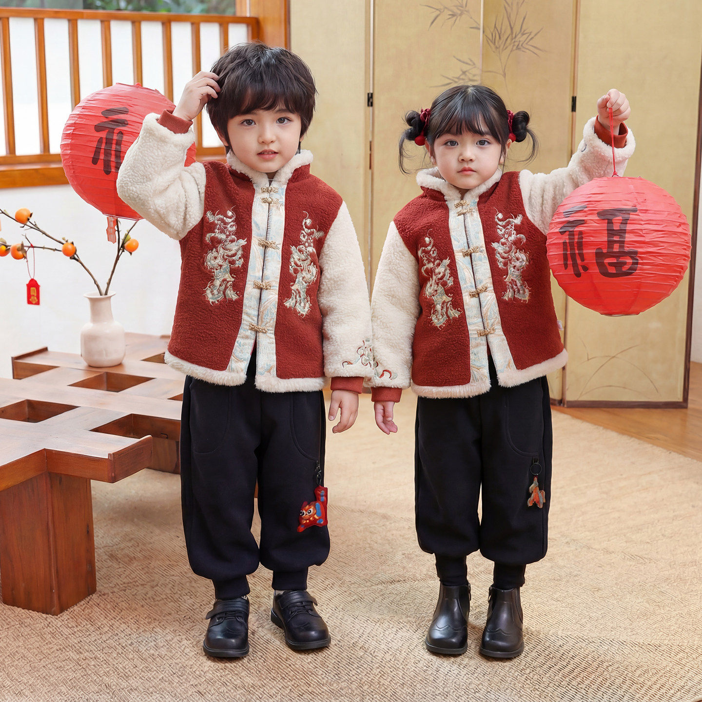 男童拜年服儿童拜冬年服新中式唐装加厚冬装过年衣服女童红色外套