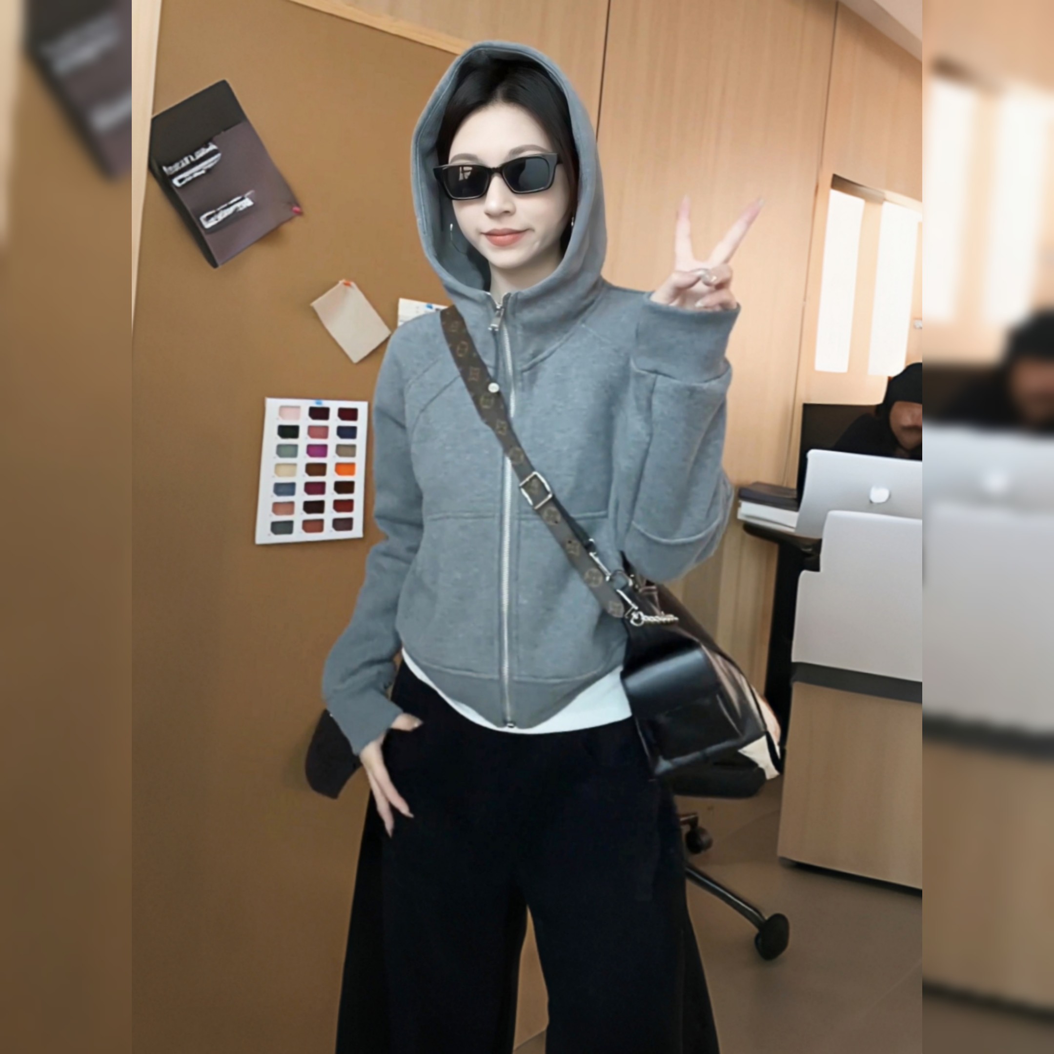 灰色连帽加绒卫衣女款秋冬2025新款爆款拉链开衫休闲外套显瘦上衣
