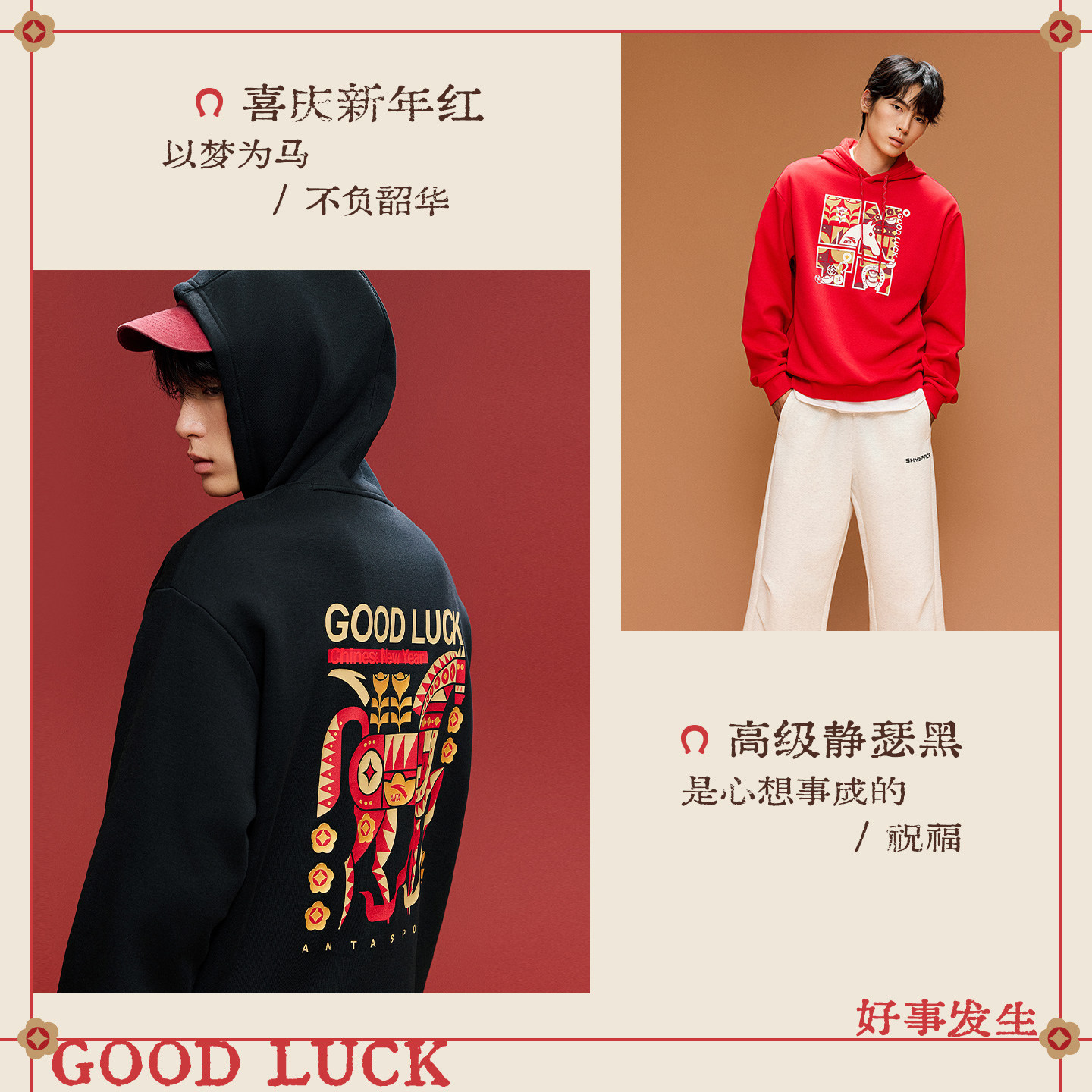 安踏好事发生新年卫衣男款冬季加绒连帽套头衫本命春节红色上衣男
