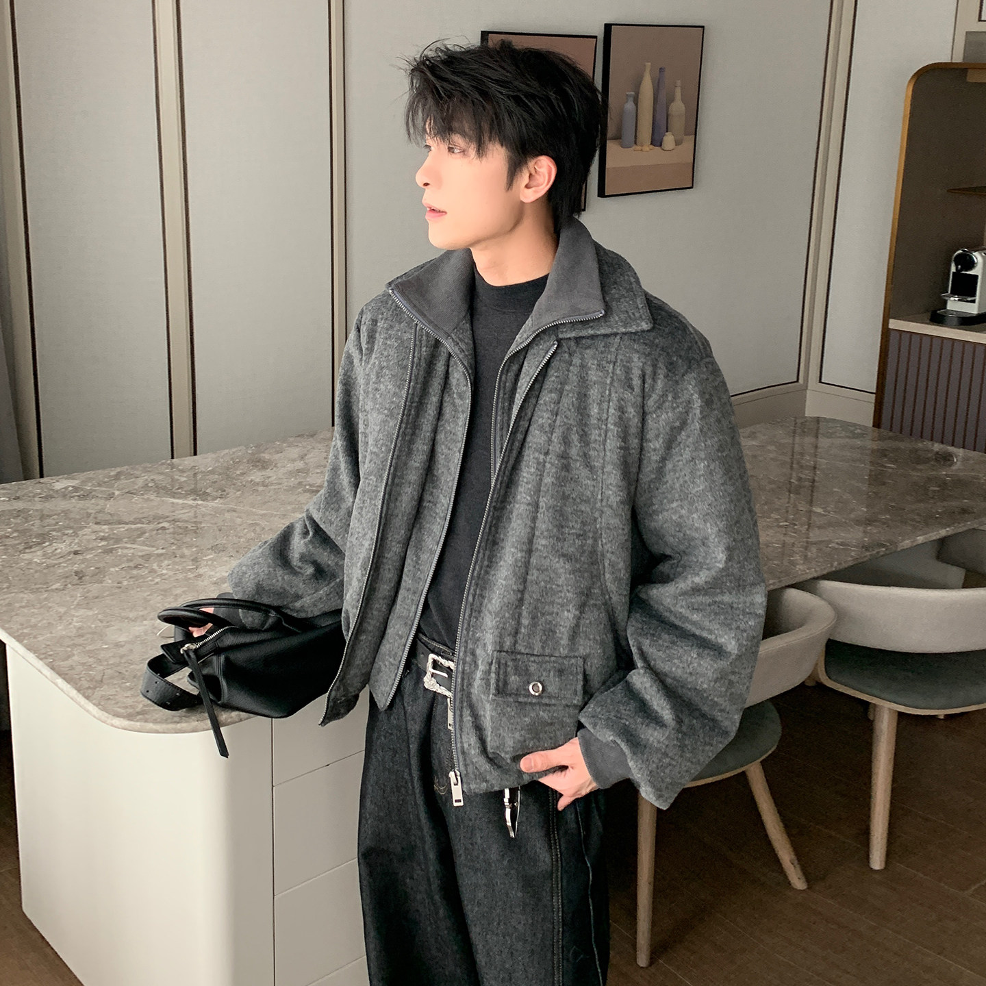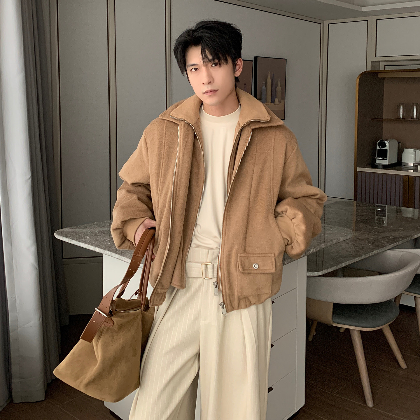 Hualun毛呢假两件羽绒服男款冬季高级感上衣男装不臃肿白鸭绒外套
