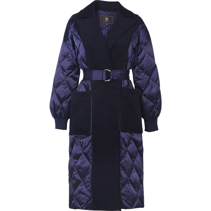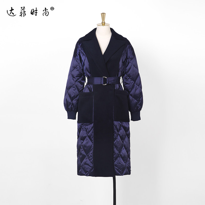2025冬装新款欧美时尚简约通勤OL拼接毛呢西装领中长款羽绒服女