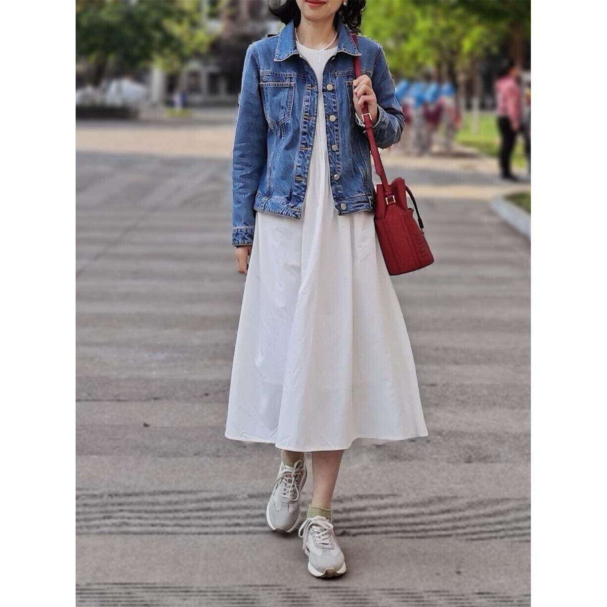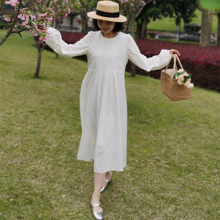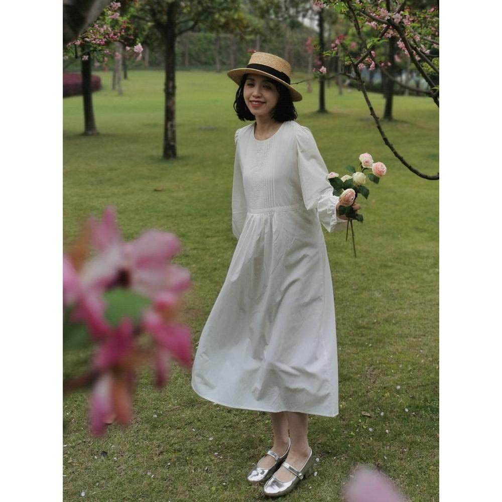出片看樱花文艺白色连衣裙2023春长袖泡泡袖气质裙子宽松长款显瘦