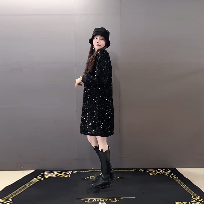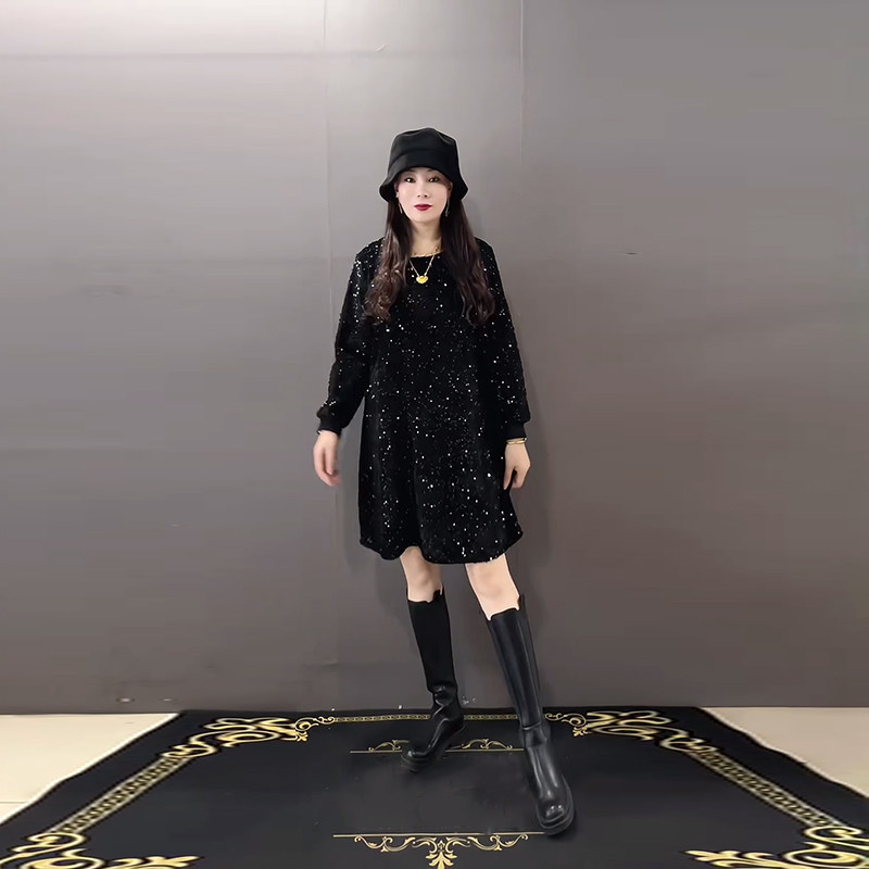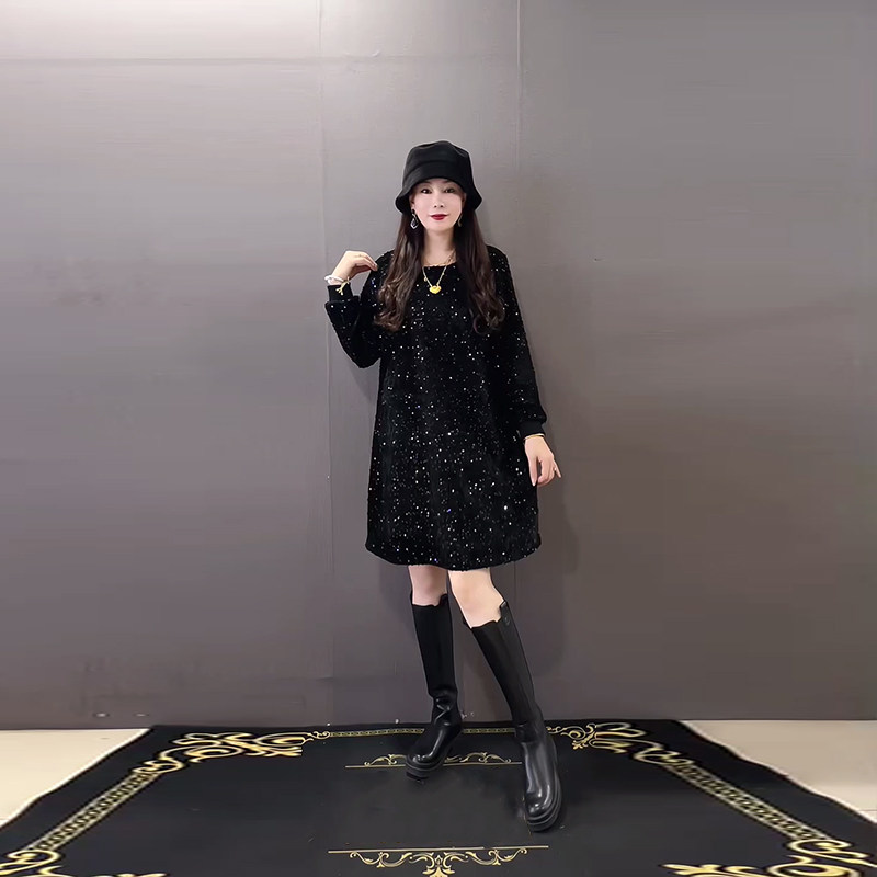 大码女装圆领长袖满身亮片连衣裙胖MM中长款黑色显瘦时尚设计裙子