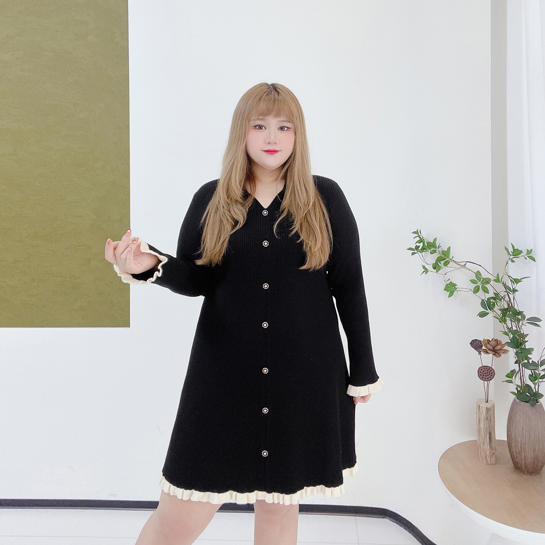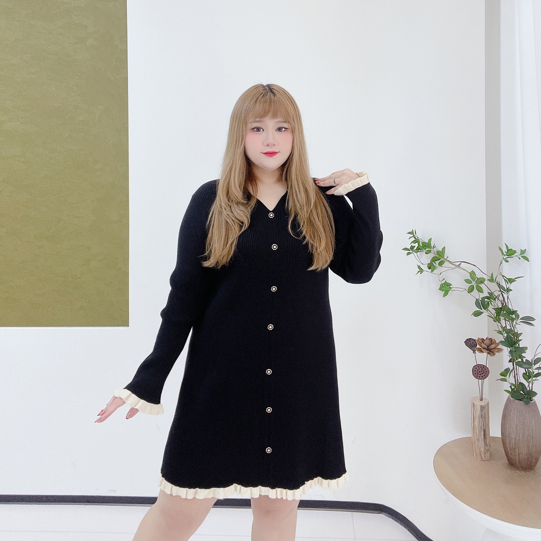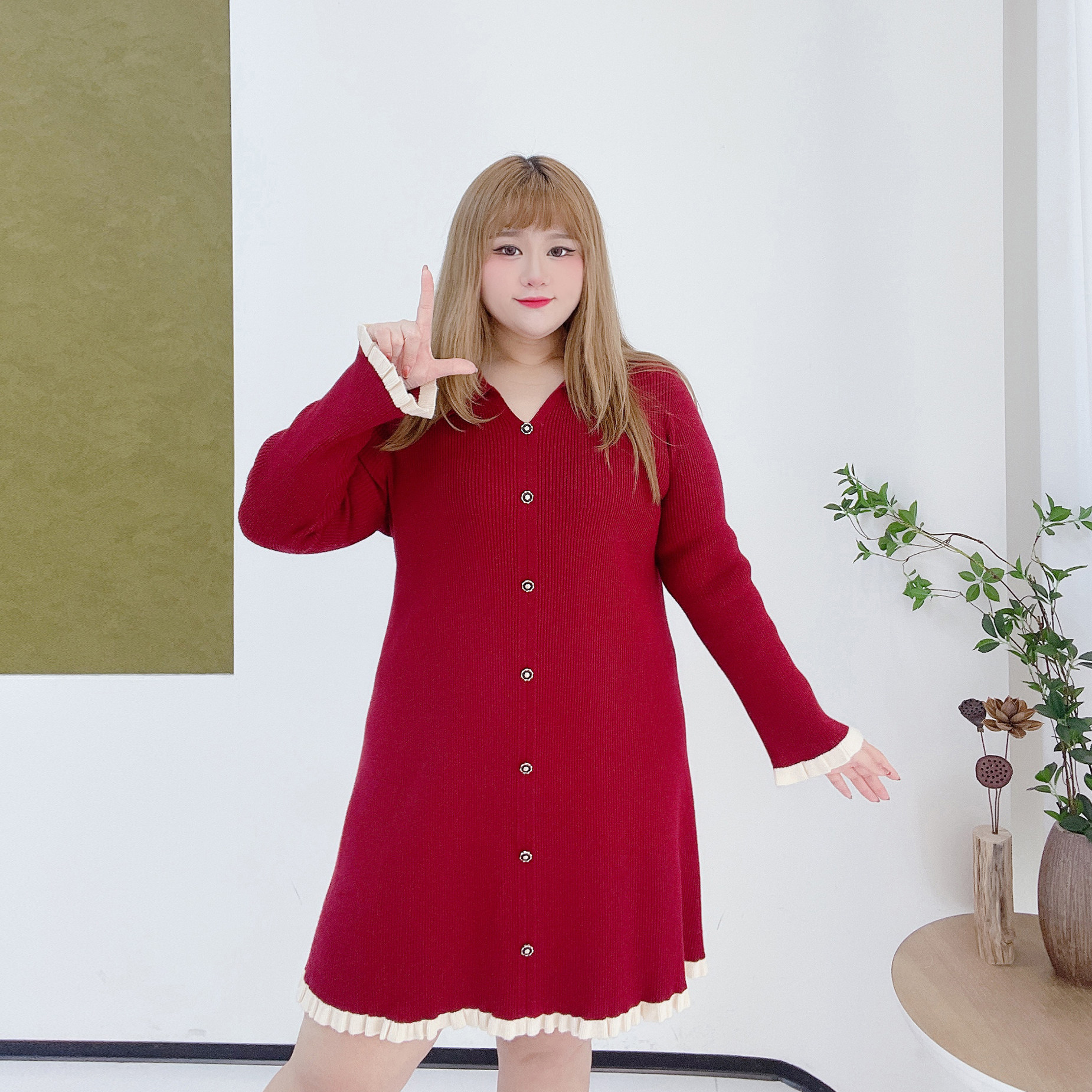 撞色花边小香内搭针织裙胖莹莹大码女装秋冬小个子显瘦红色连衣裙