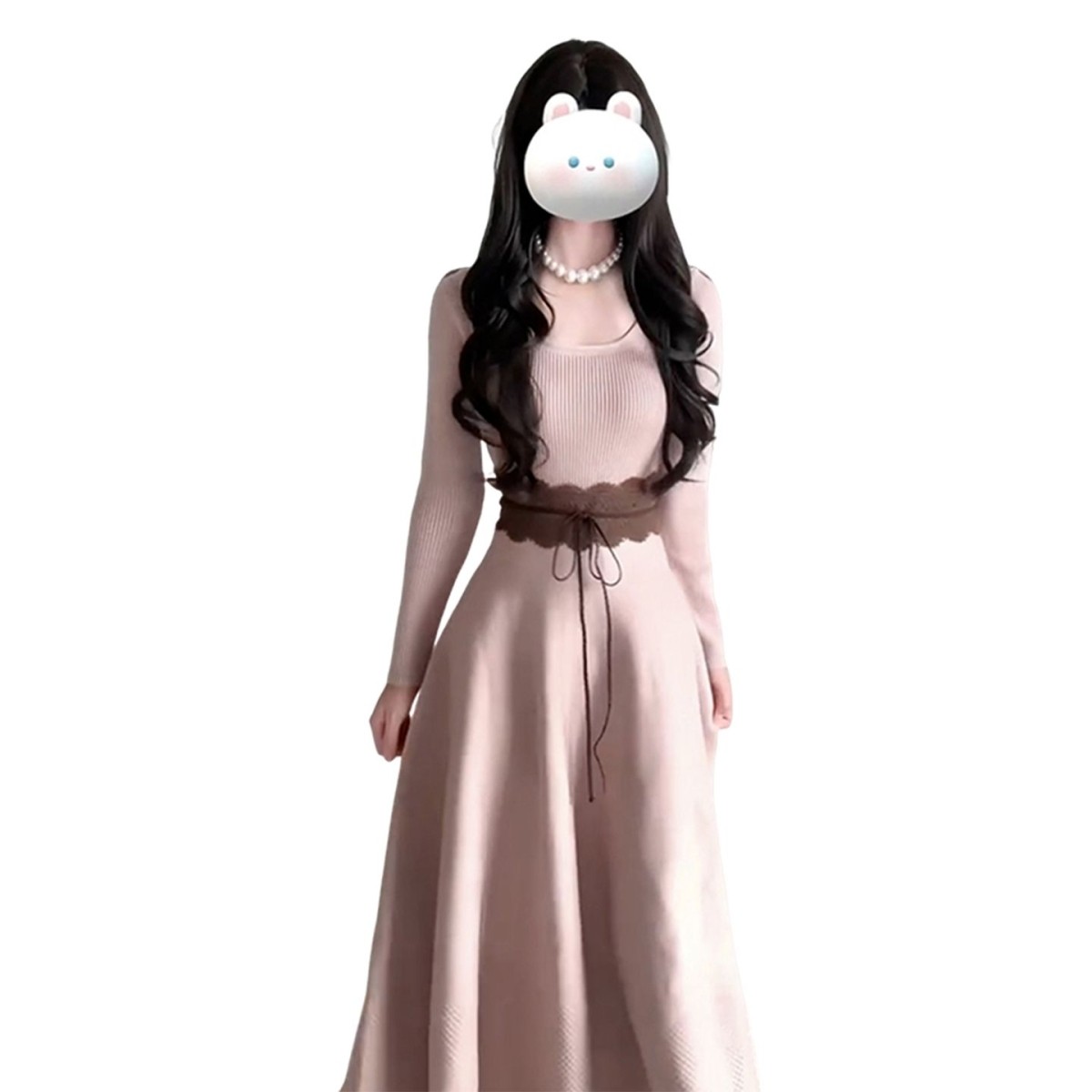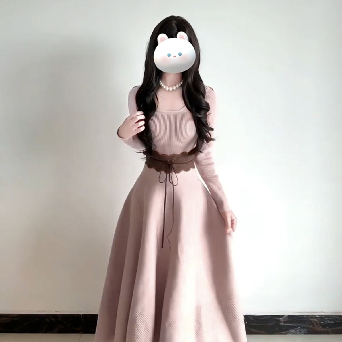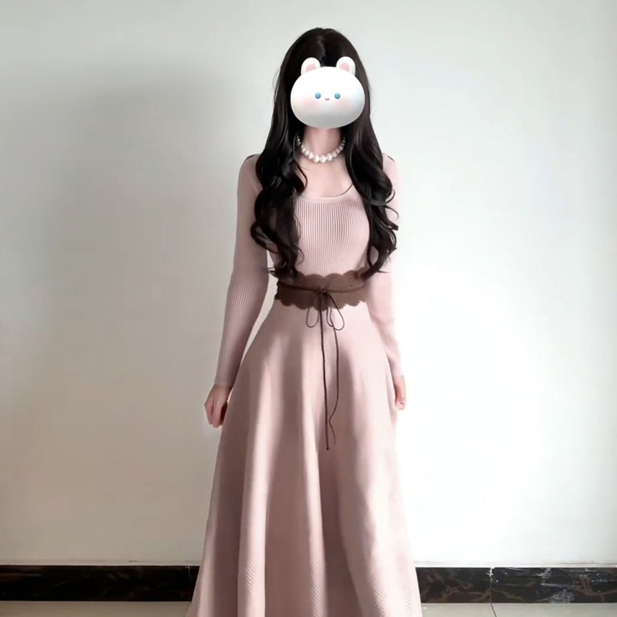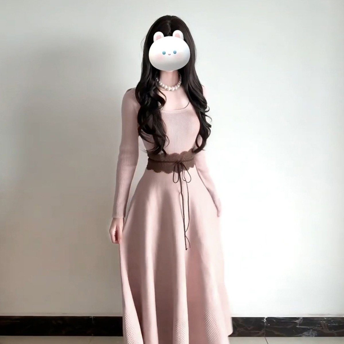 温柔风粉色针织长袖连衣裙子女秋冬2025新款法式内搭打底收腰长裙
