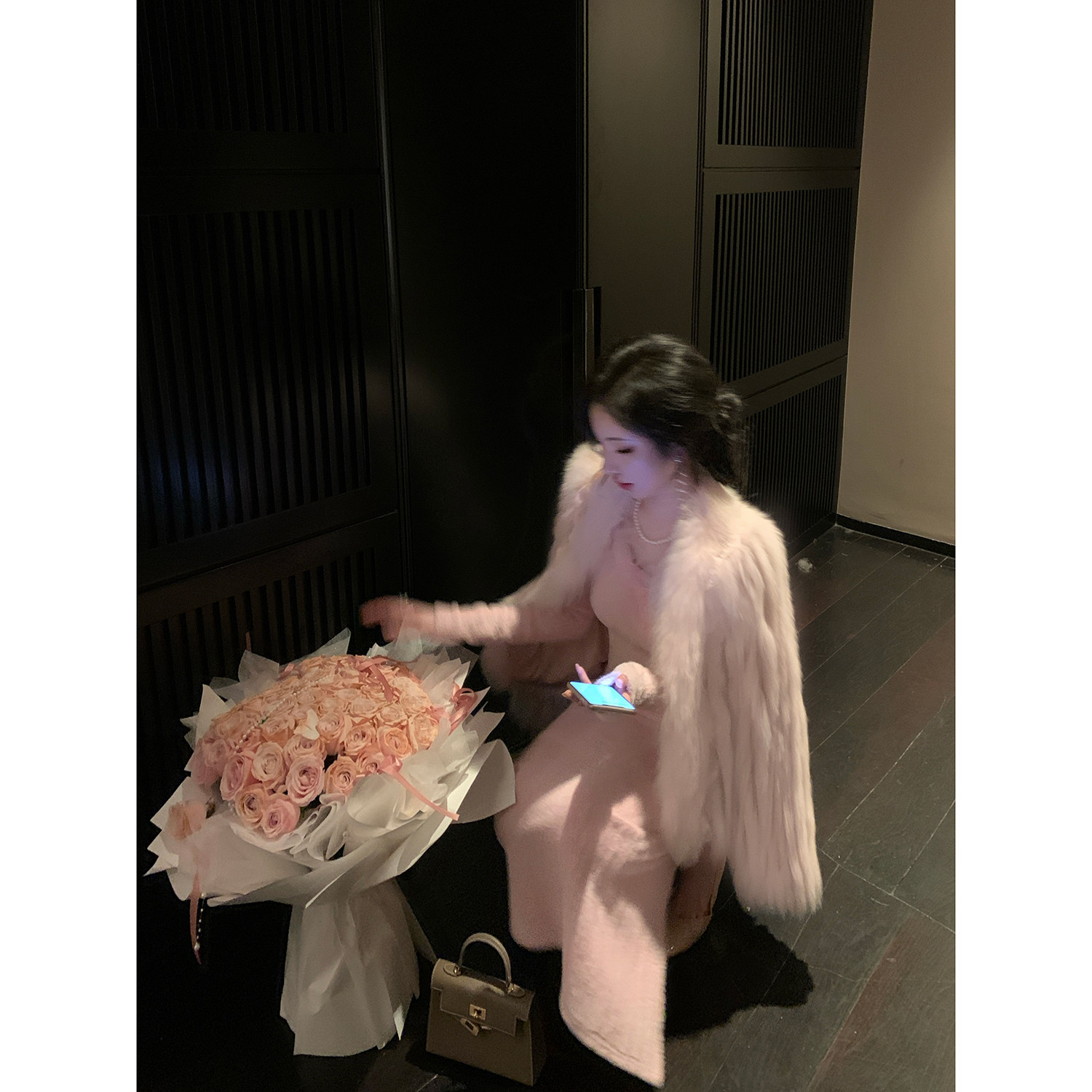 Sun雅乔【粉色芍药】秋冬粉色设计感修身花朵长袖软糯针织连衣裙
