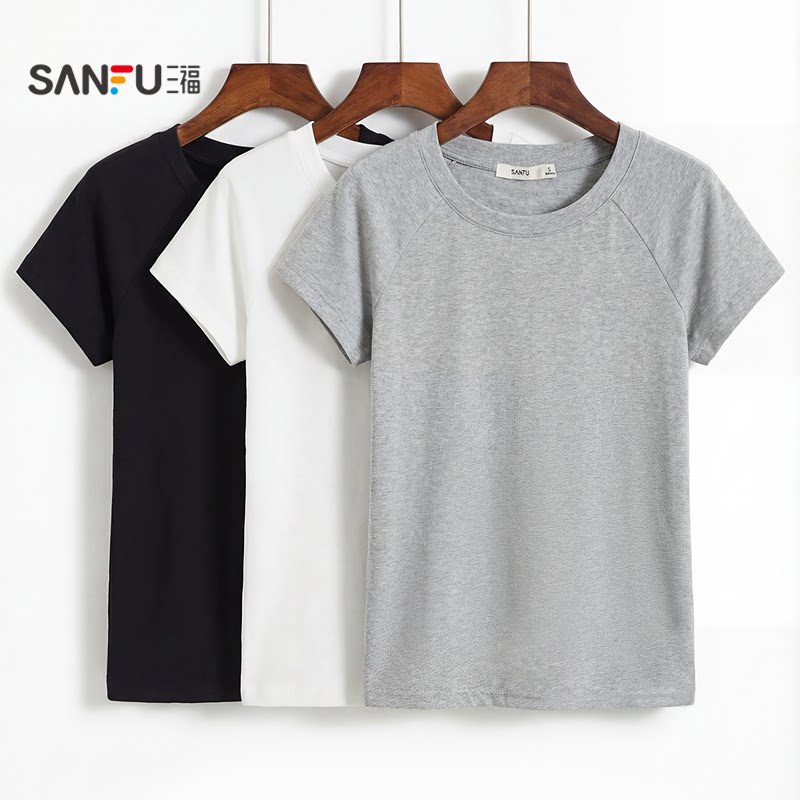 三福修身纯色短袖女2026新款夏季简约休闲圆领t恤插肩袖上衣女装