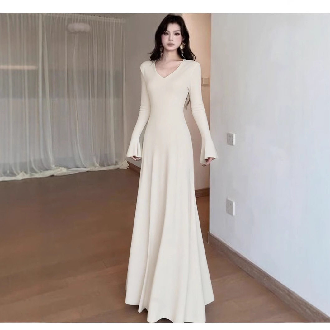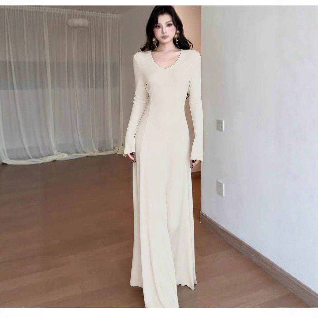 白色针织连衣裙女秋冬季修身休闲内搭打底长裙子加绒加厚老钱风