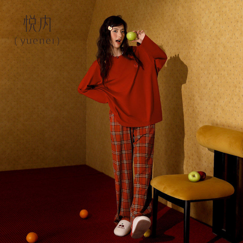 悦内带胸垫睡衣女款春秋季纯棉长袖套头圆领大码家居服红色本命年
