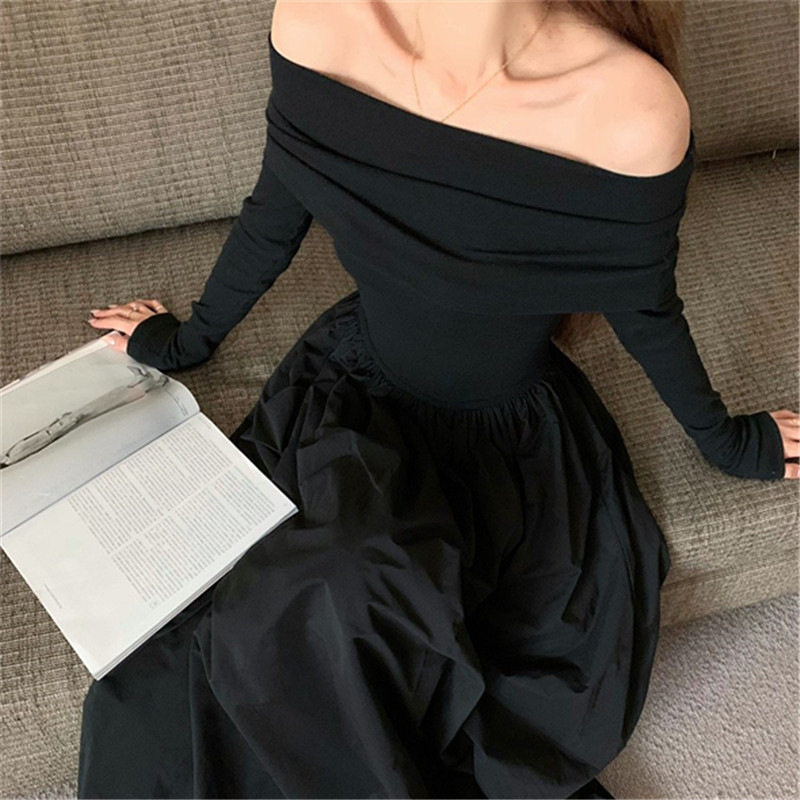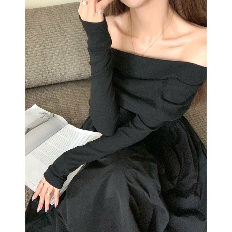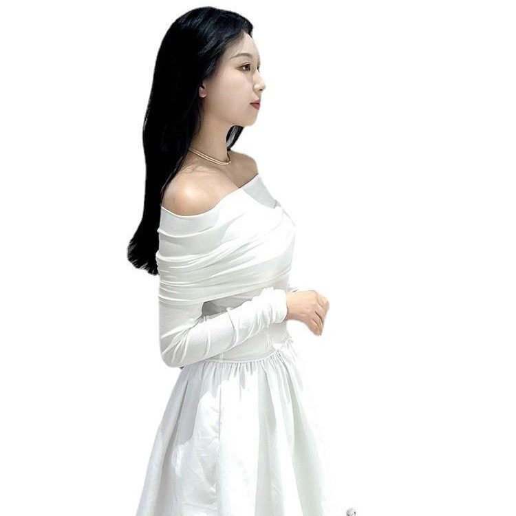 纯欲一字露肩长袖白色连衣裙女春秋季2023新款法式赫本风气质长裙