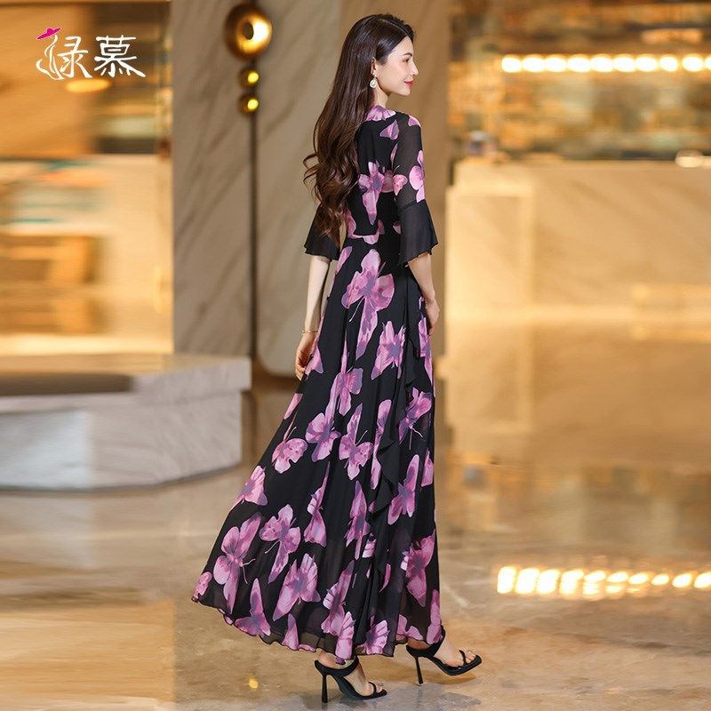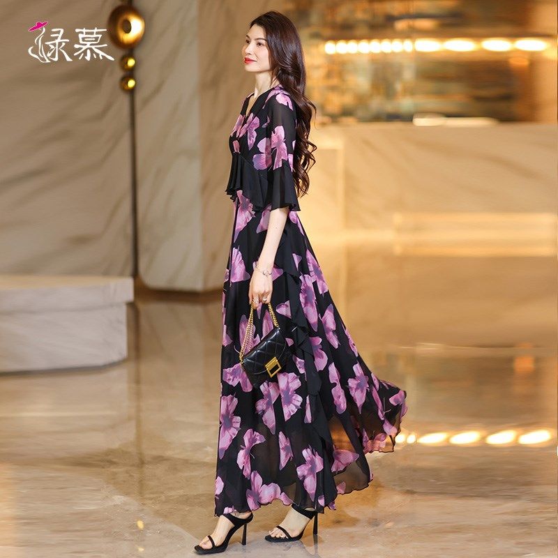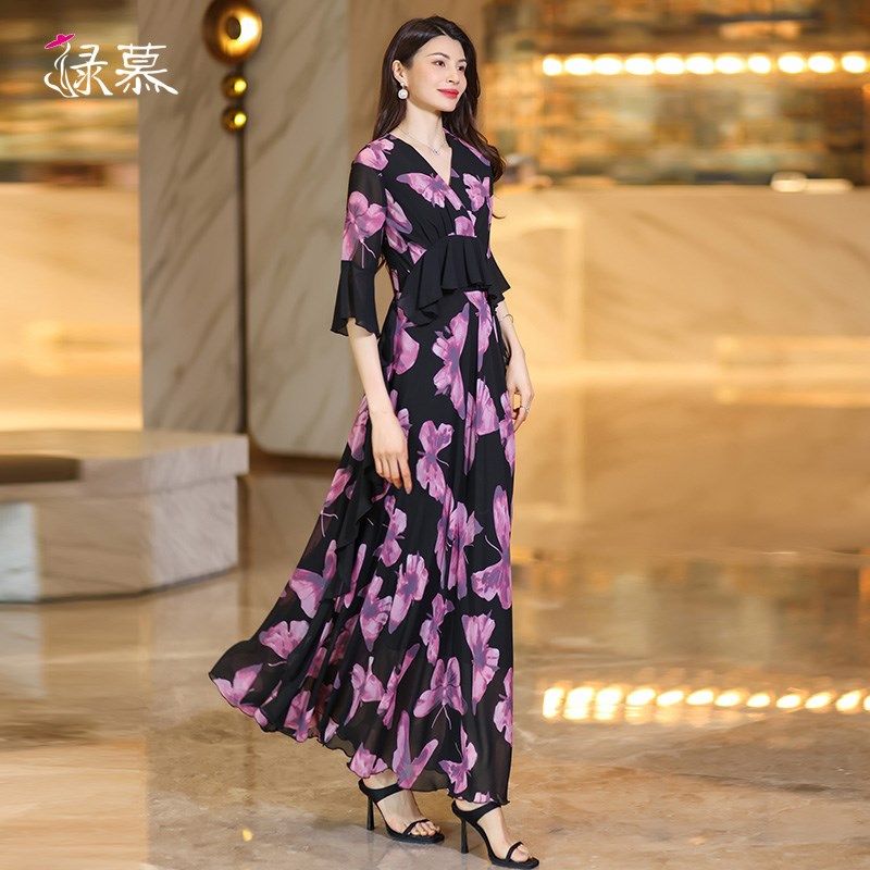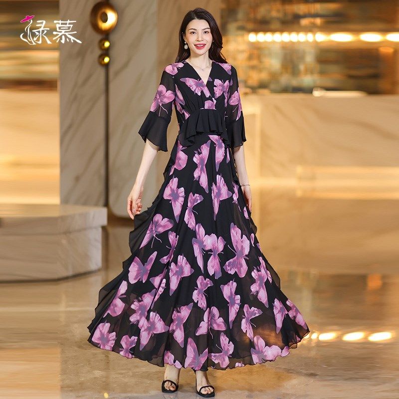 2025新款轻奢高级感收腰显瘦雪纺连衣裙长款女夏季气质印花超长裙