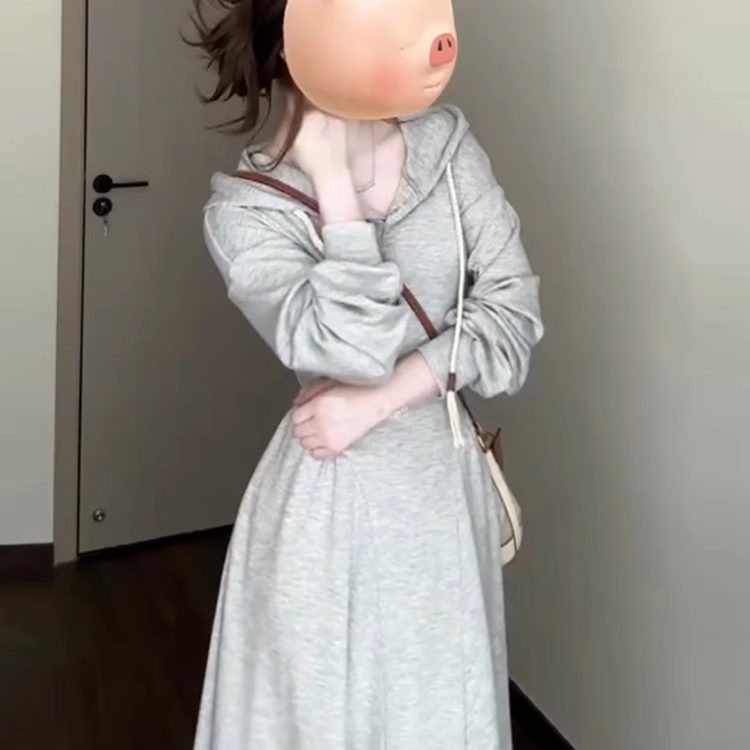 小个子灰色连帽长袖连衣裙女装秋季2025新款韩系穿搭超火卫衣长裙