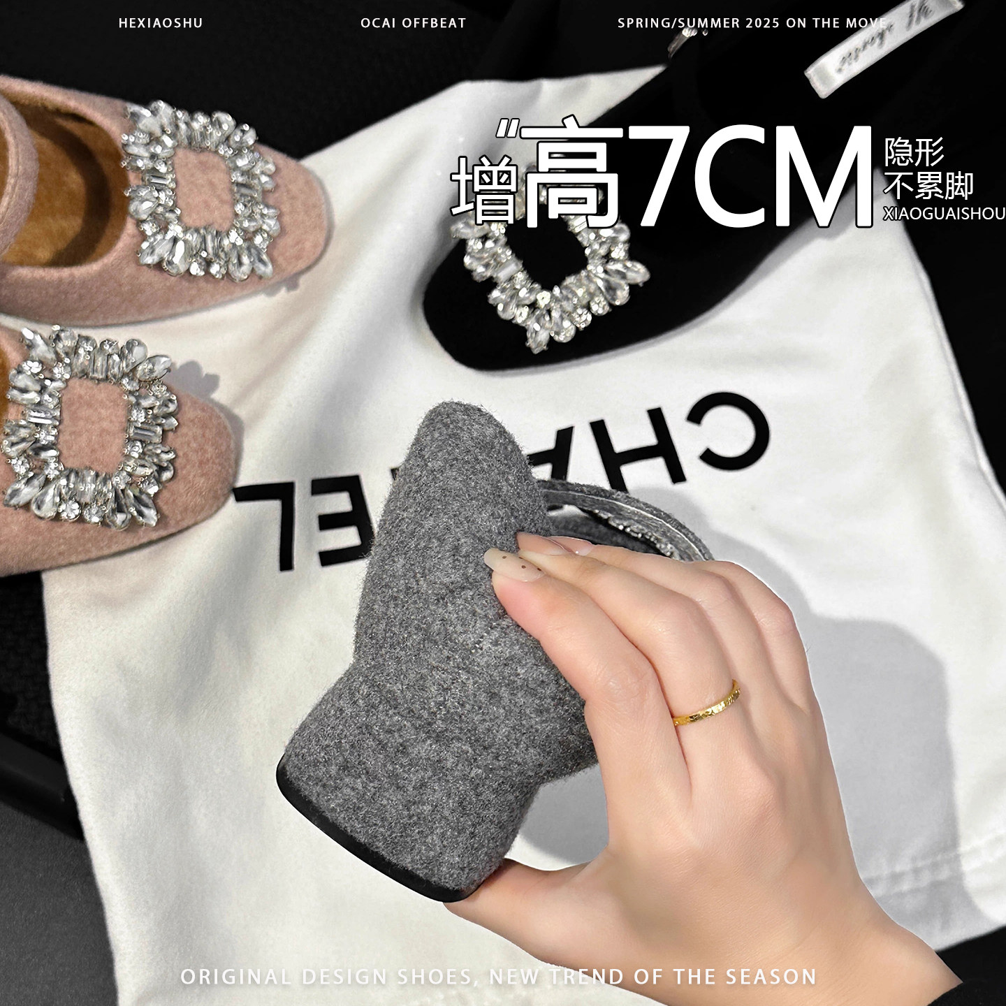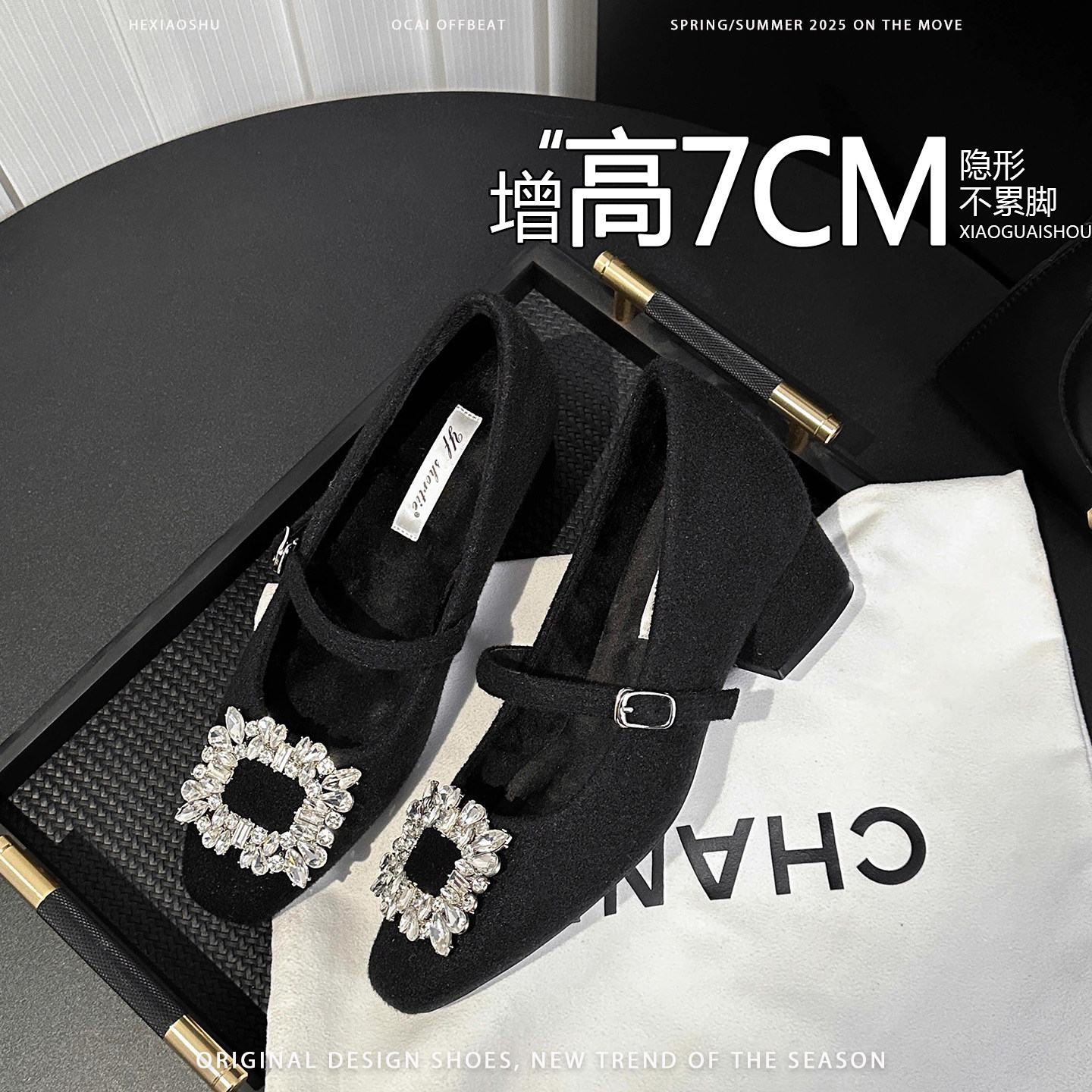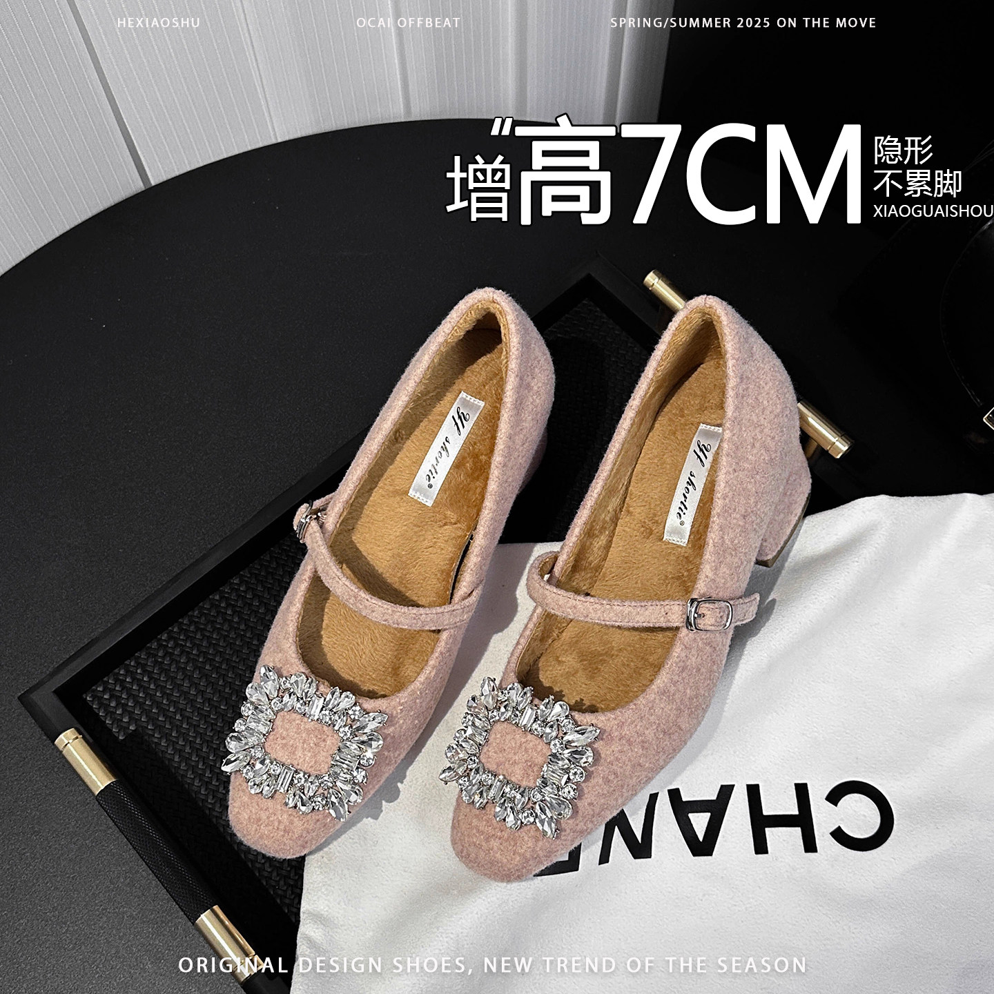 法式内增高7CM水钻方扣加绒玛丽珍鞋女2025新款绒面粗跟毛毛单鞋