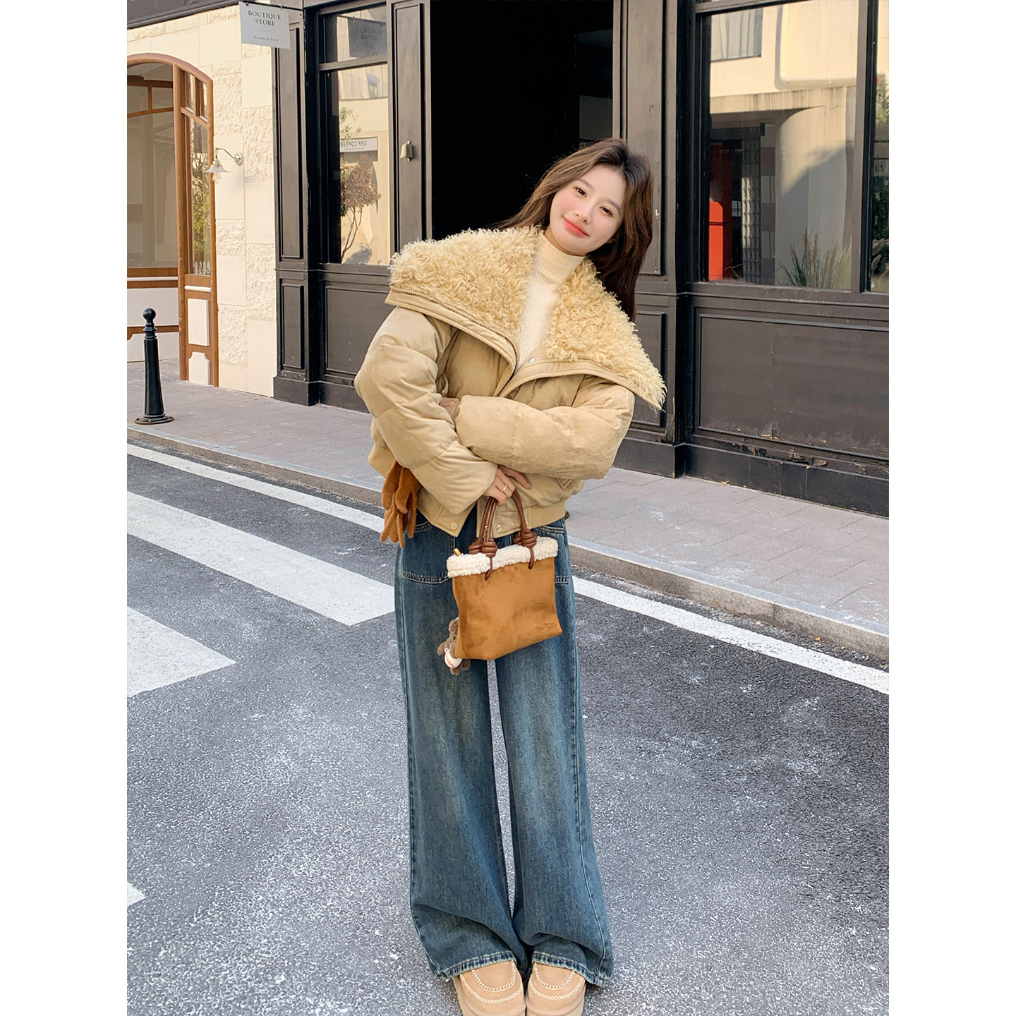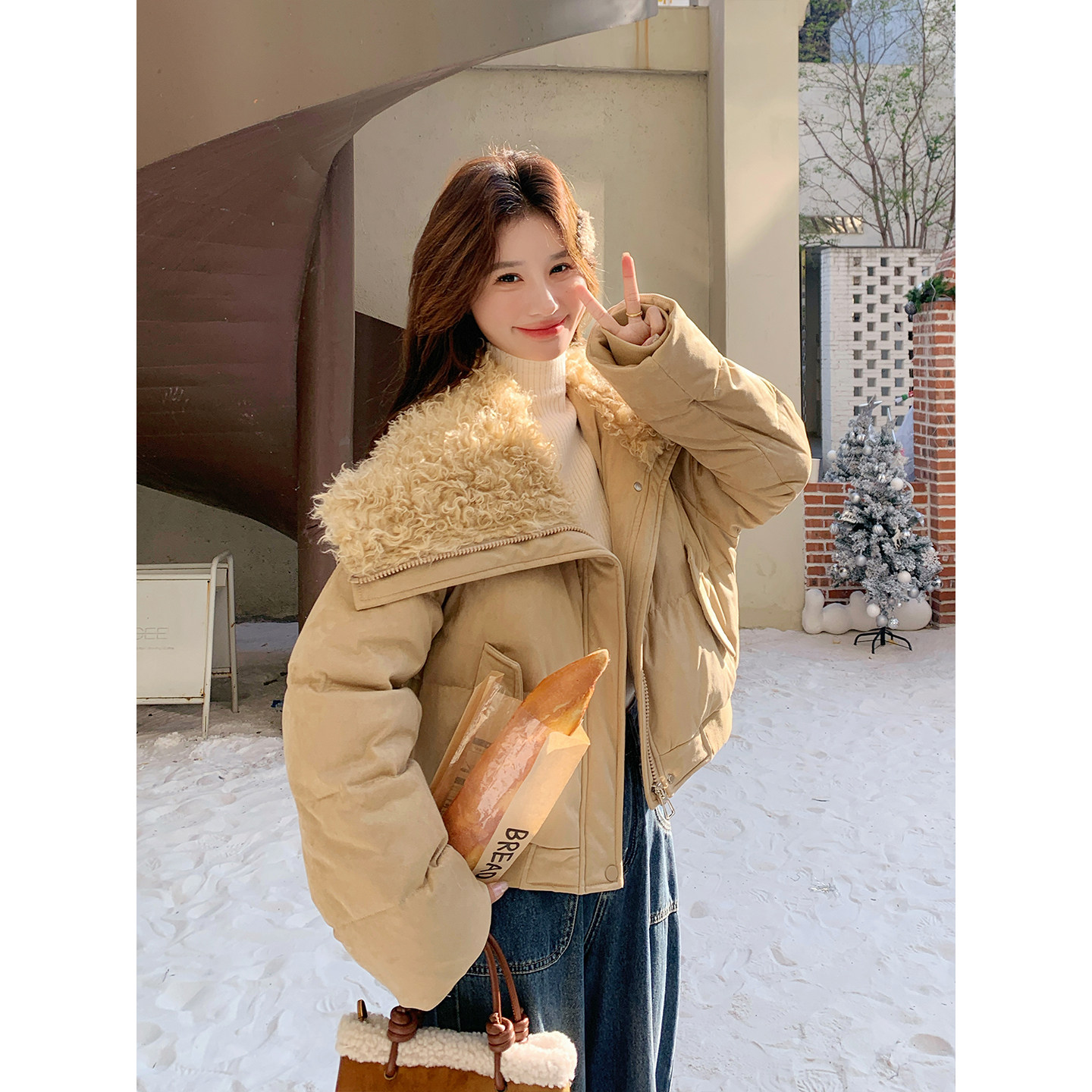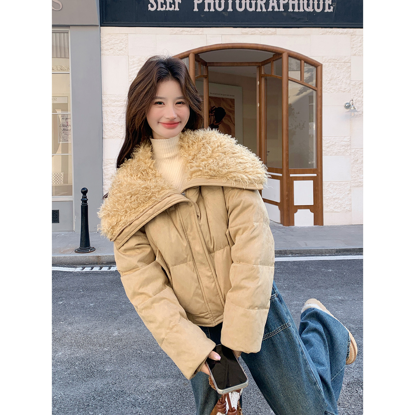 卡其色羊羔毛大翻领麂皮绒羽绒服女短款2025冬新款设计感90绒外套