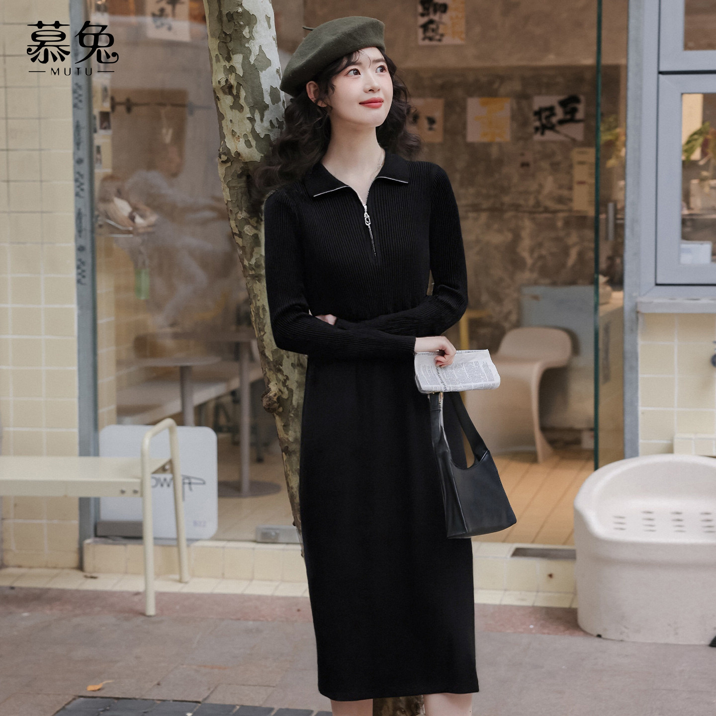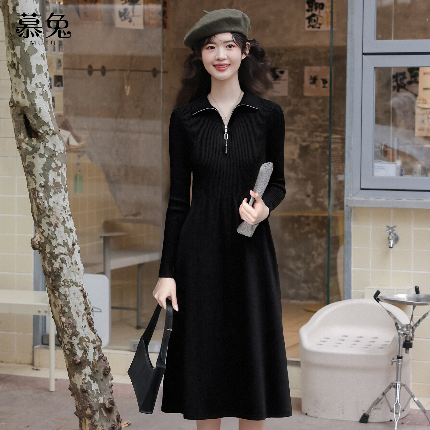慕兔温柔风长袖针织连衣裙女2025冬季新款小个子收腰显瘦打底裙子