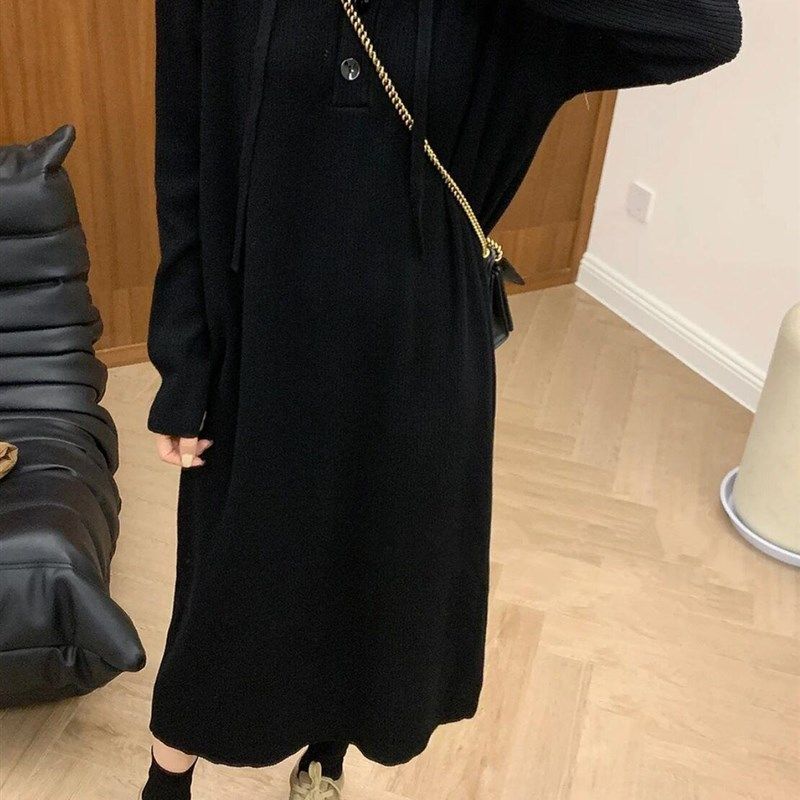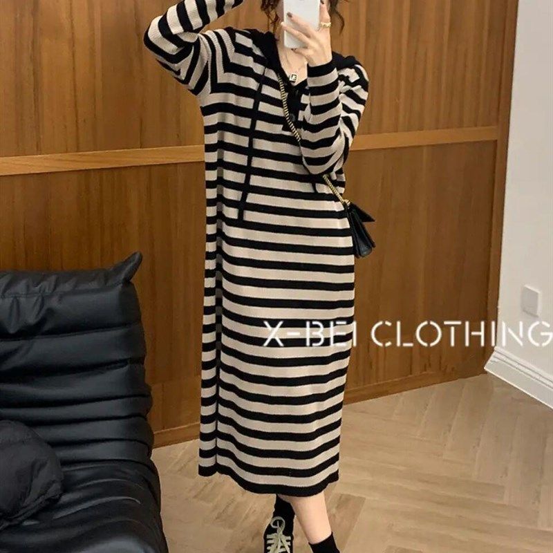 欧货高级设计感连帽针织连衣裙女秋冬小个子百搭休闲显瘦条纹裙子