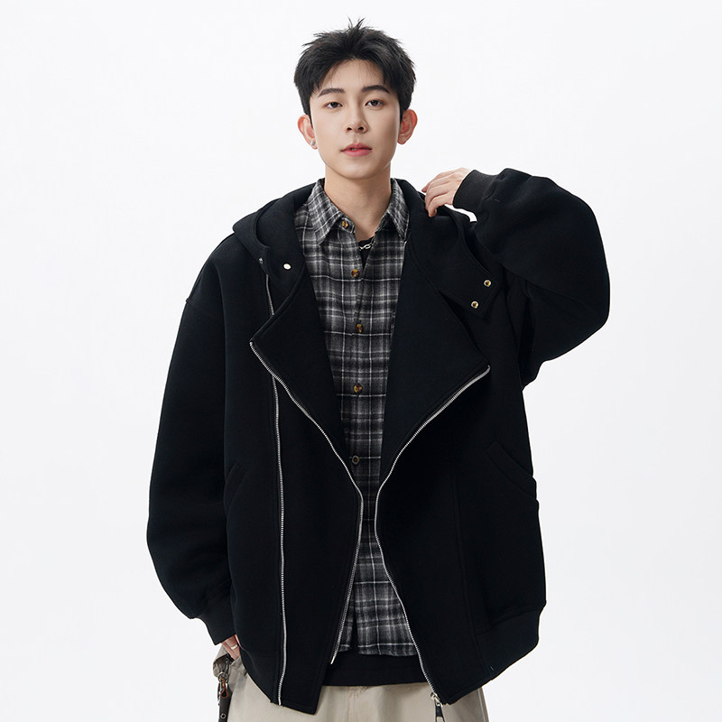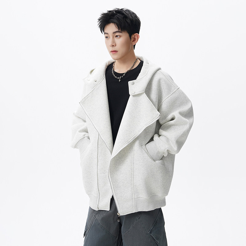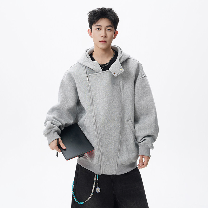 迈特优春秋美式重磅灰色上衣双拉链开衫空气层连帽卫衣外套男女款
