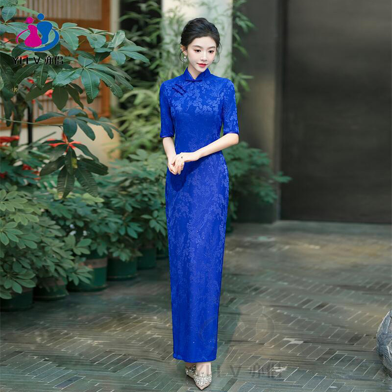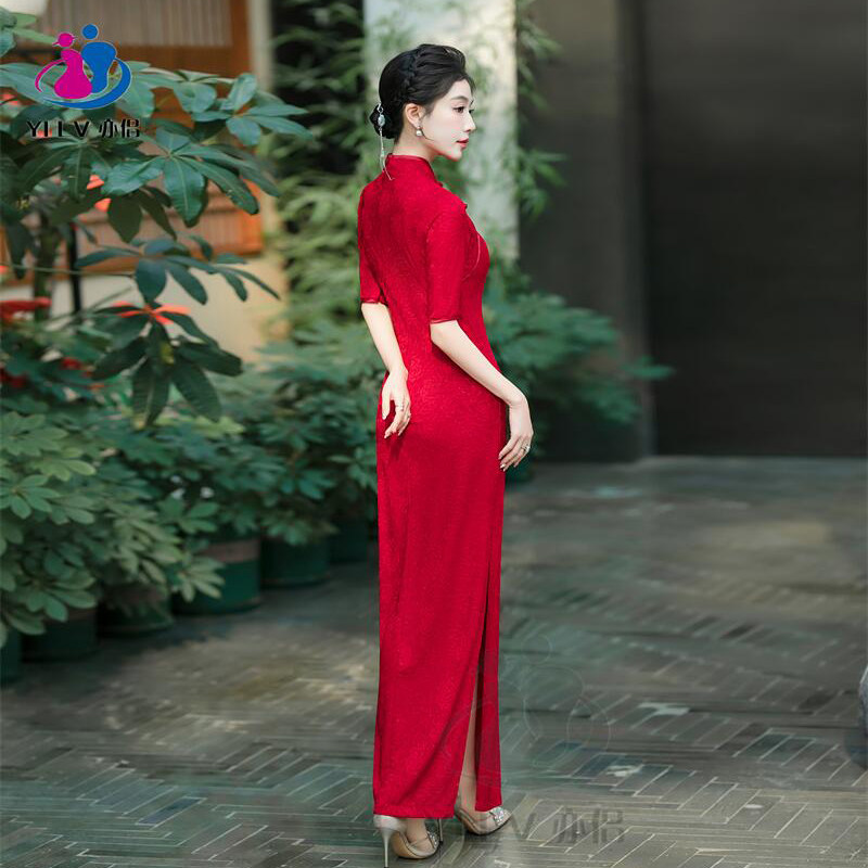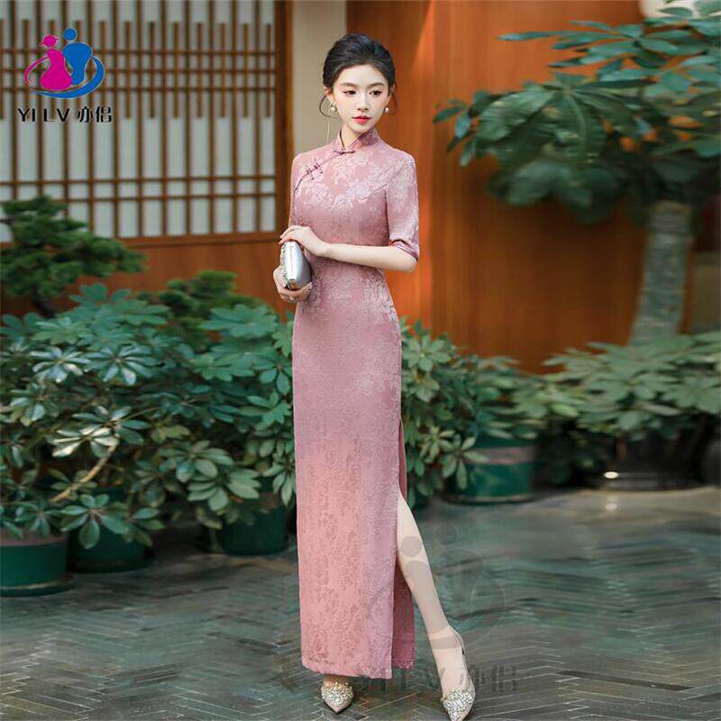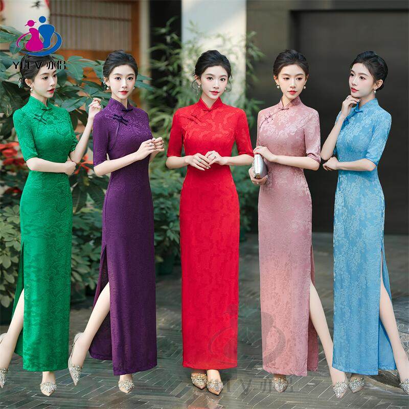 旗袍中式新款红色长款提花2025喜婆婆年会修身气质走秀表演连衣裙