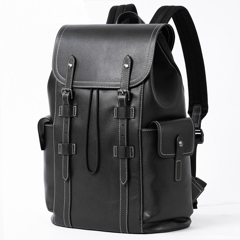 欧美风范牛皮双肩包男女款商务大背包大容量电脑包撞色线真皮书包