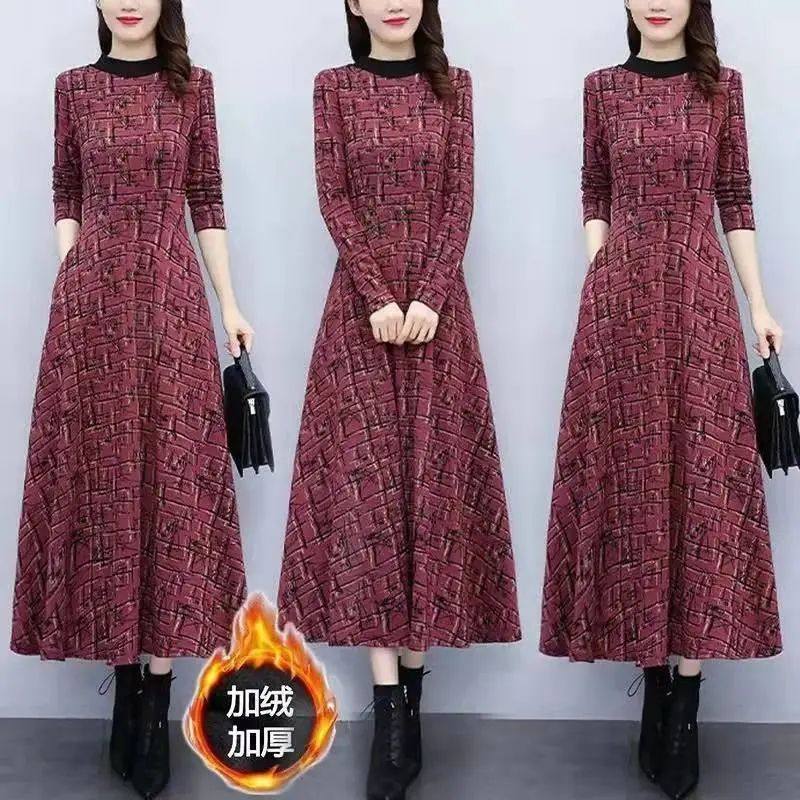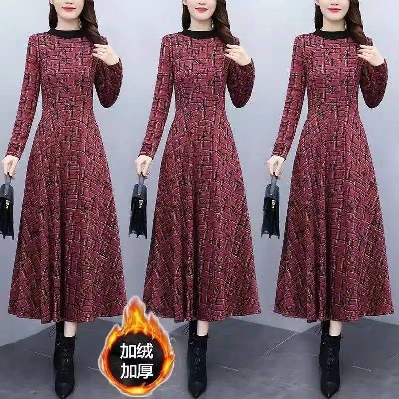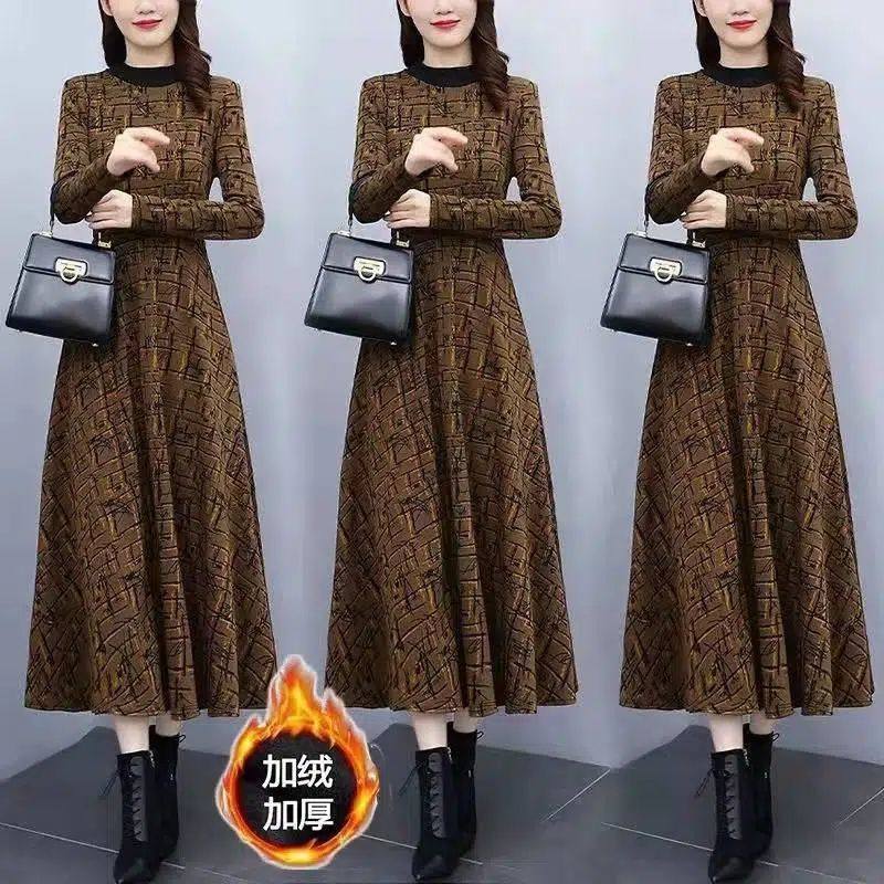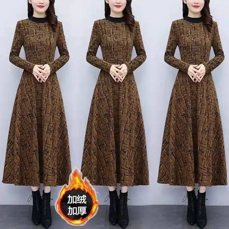 秋冬加绒长袖连衣裙新款高端女装洋气妈妈装长款裙子保暖加厚冬裙