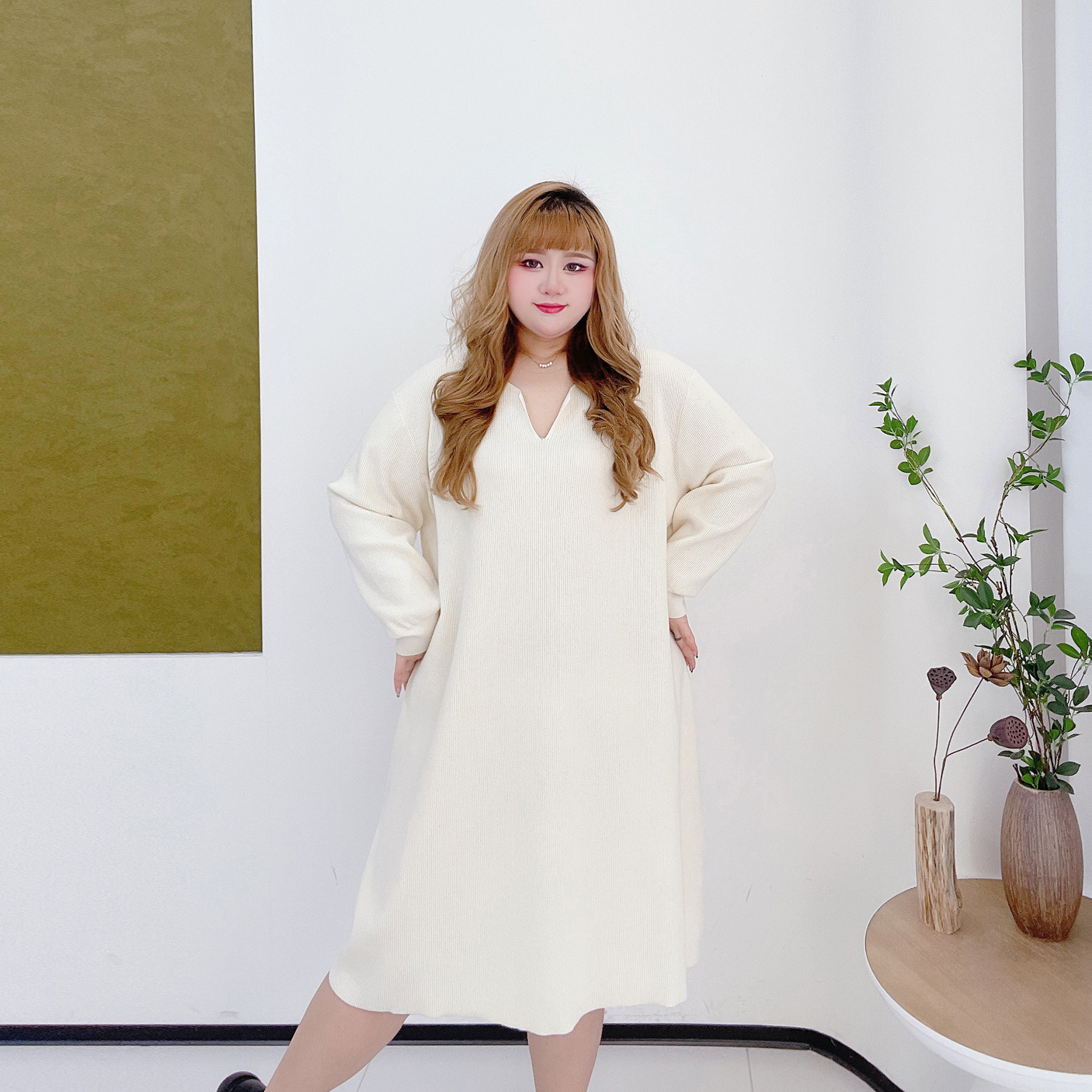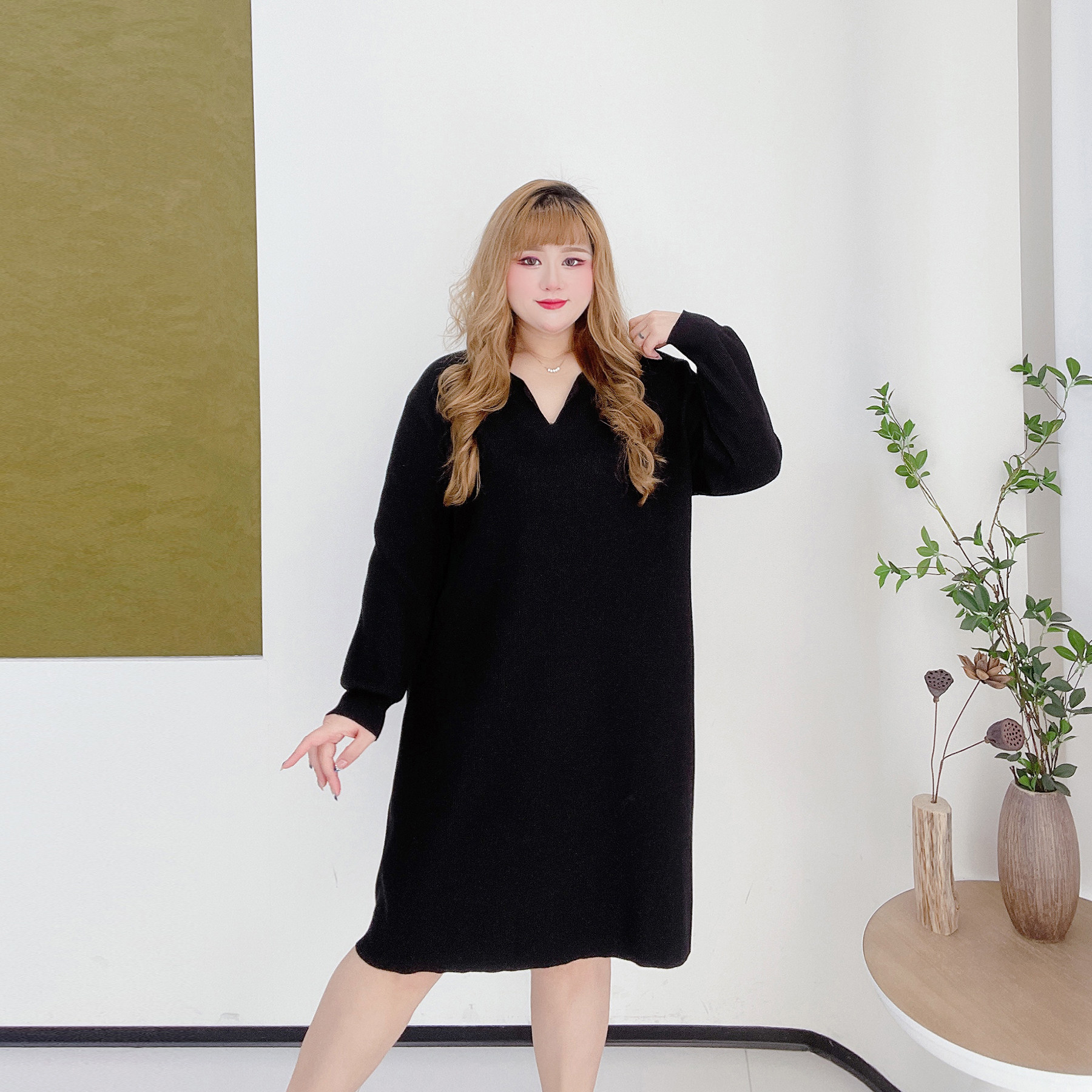 300斤慵懒风软糯毛衣裙子胖莹莹大码女装秋冬中长款简约v领连衣裙